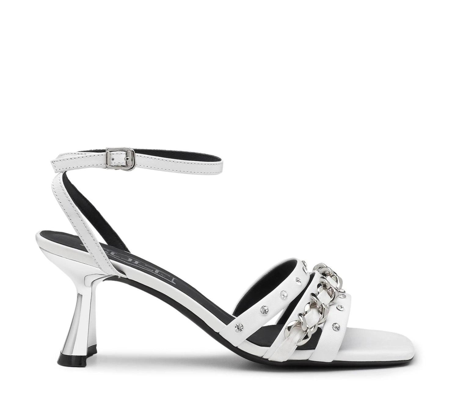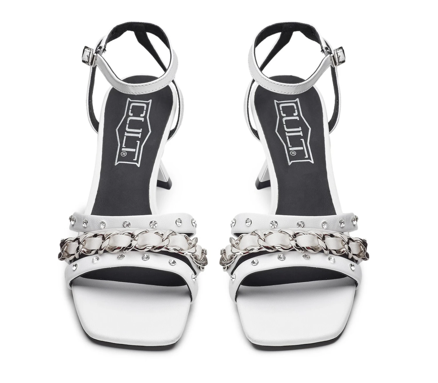 Affidatevi ai sandali di Cult per aggiungere un modello d’effetto nel vostro guardaroba. Completati da luminoso tacco specchiato, sono realizzati in pelle dalla punta quadrata e definiti da cinturini con borchie e catene metalliche.