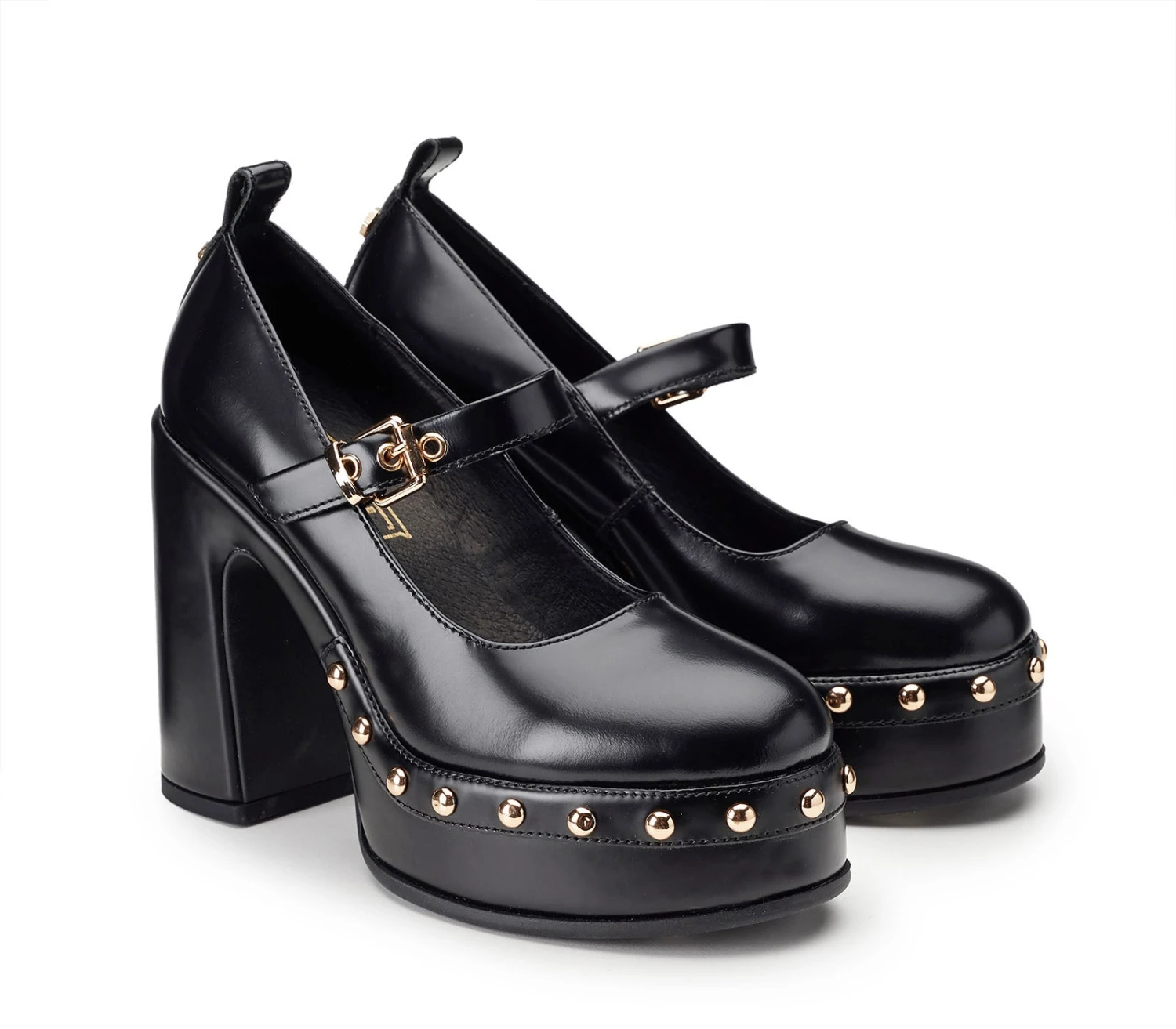 Valorizzate il vostro lato femminile con le pumps Mary Jane di Cult. Il modello presenta tacco scultoreo, spesso plateau e cinturino sul davanti ed è impreziosito con maxi borchie sferiche d’orate in stile zoccolo. Altezza tacco 12 cm