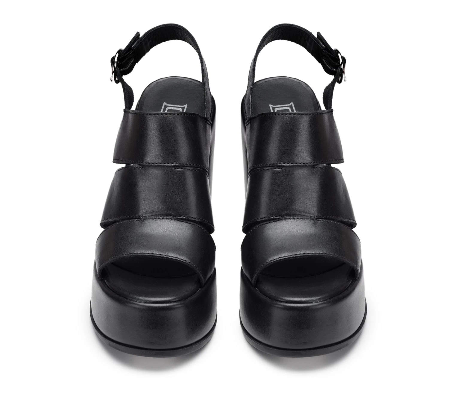 Fate risplendere il vostro stile con i sandali BJORK in pelle nera firmati Cult per questa nuova stagione. Dotati di un audace tacco a blocco e un generoso plateau, si distinguono per la loro tripla fascia superiore che esalta una silhouette inconfondibile. Un must-have per le amanti del glam-rock al femminile.