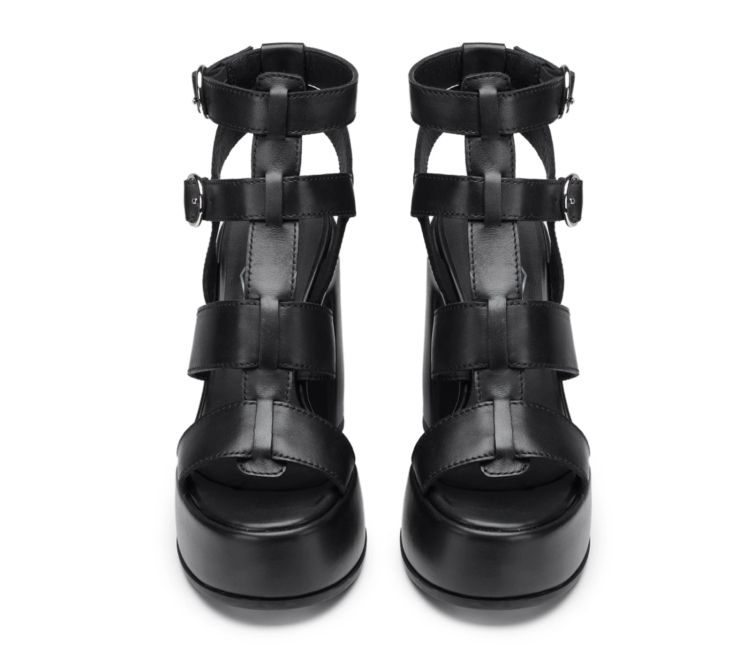 Catturate tutti gli sguardi con i sandali BJORK in pelle nera realizzati da Cult per questa nuova stagione. Caratterizzati da un audace tacco a blocco, presentano un generoso plateau, fasce in pelle che avvolgono interamente il collo del piede e una chiusura alla caviglia con fibbie metalliche. Un must-have per gli amanti del glam-rock tutto al femminile.