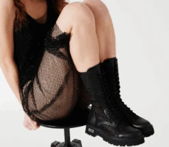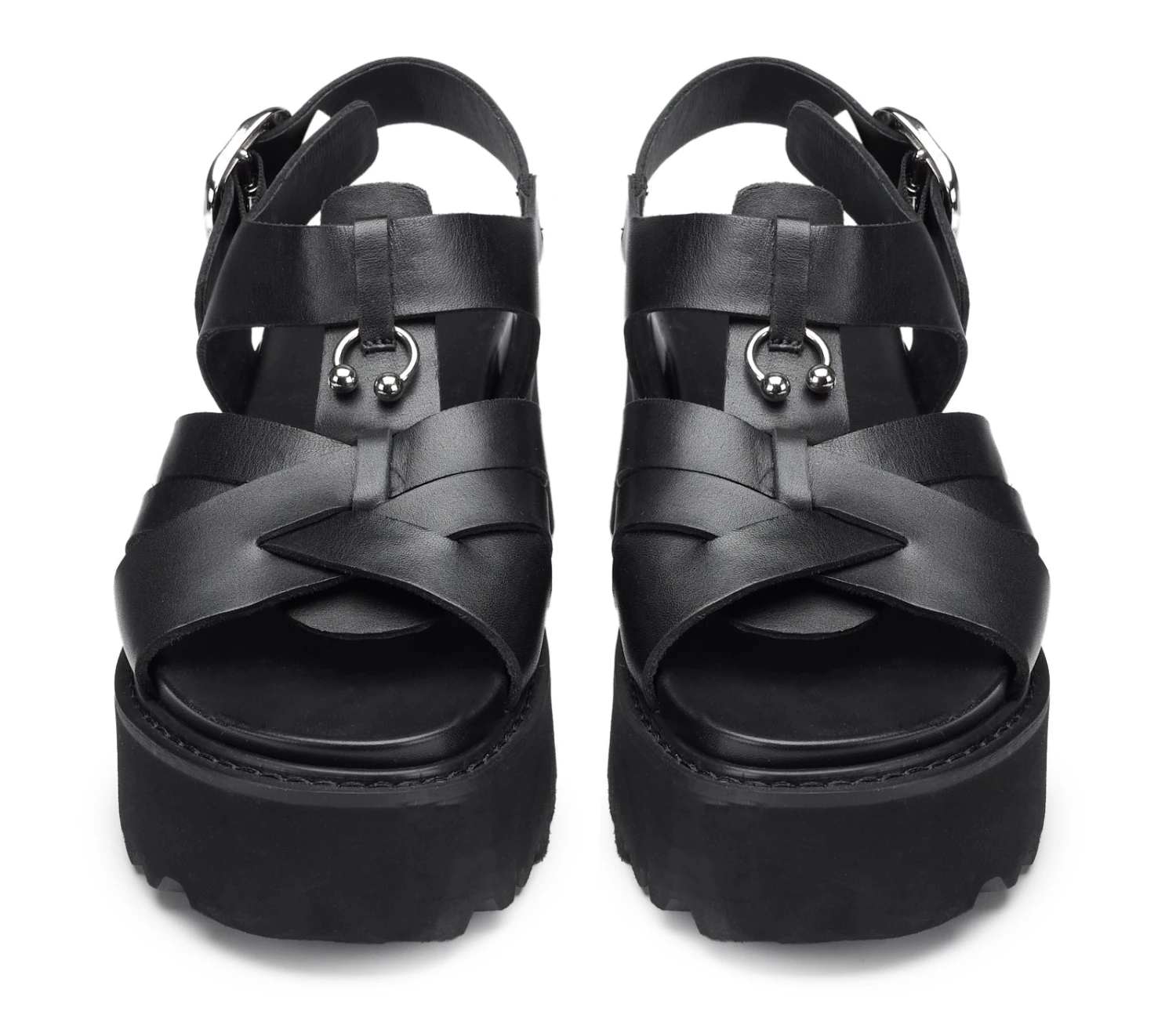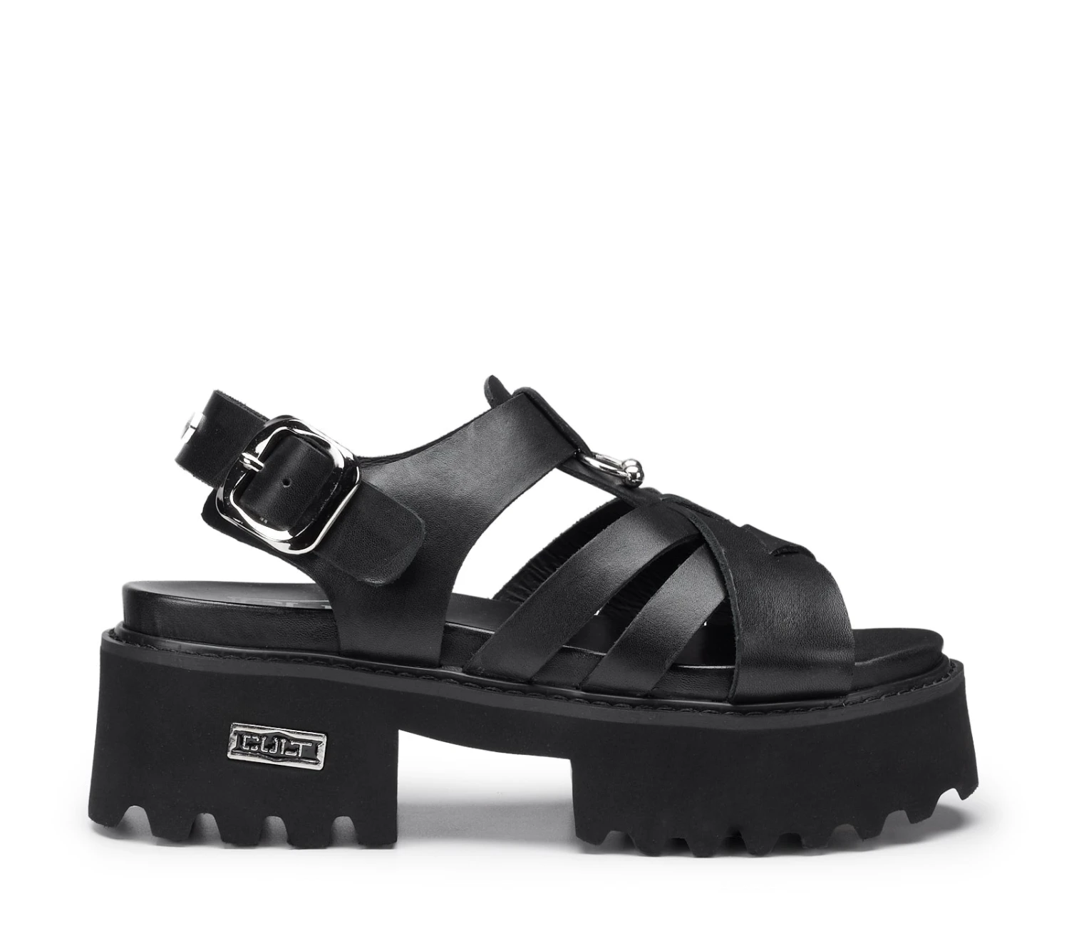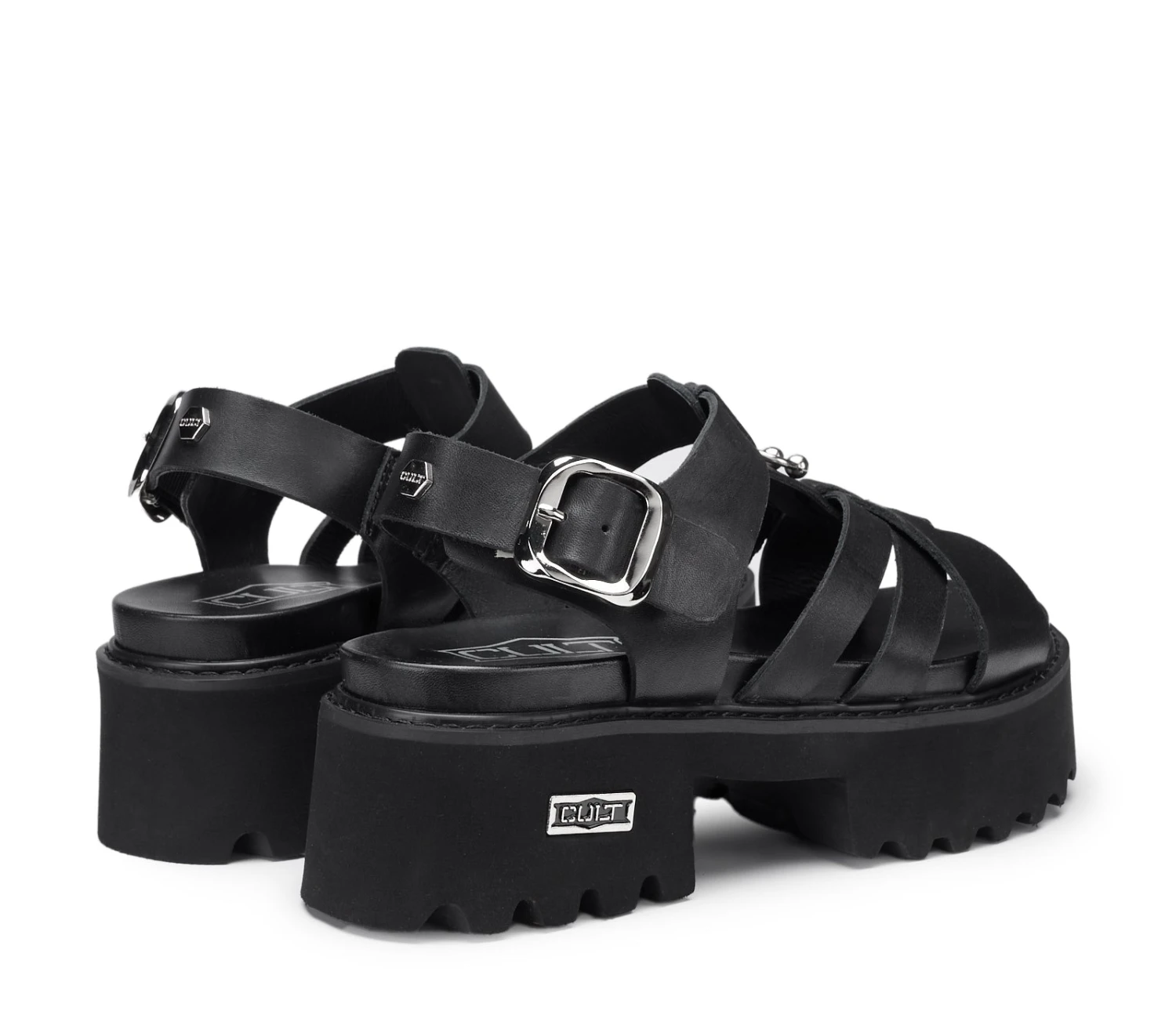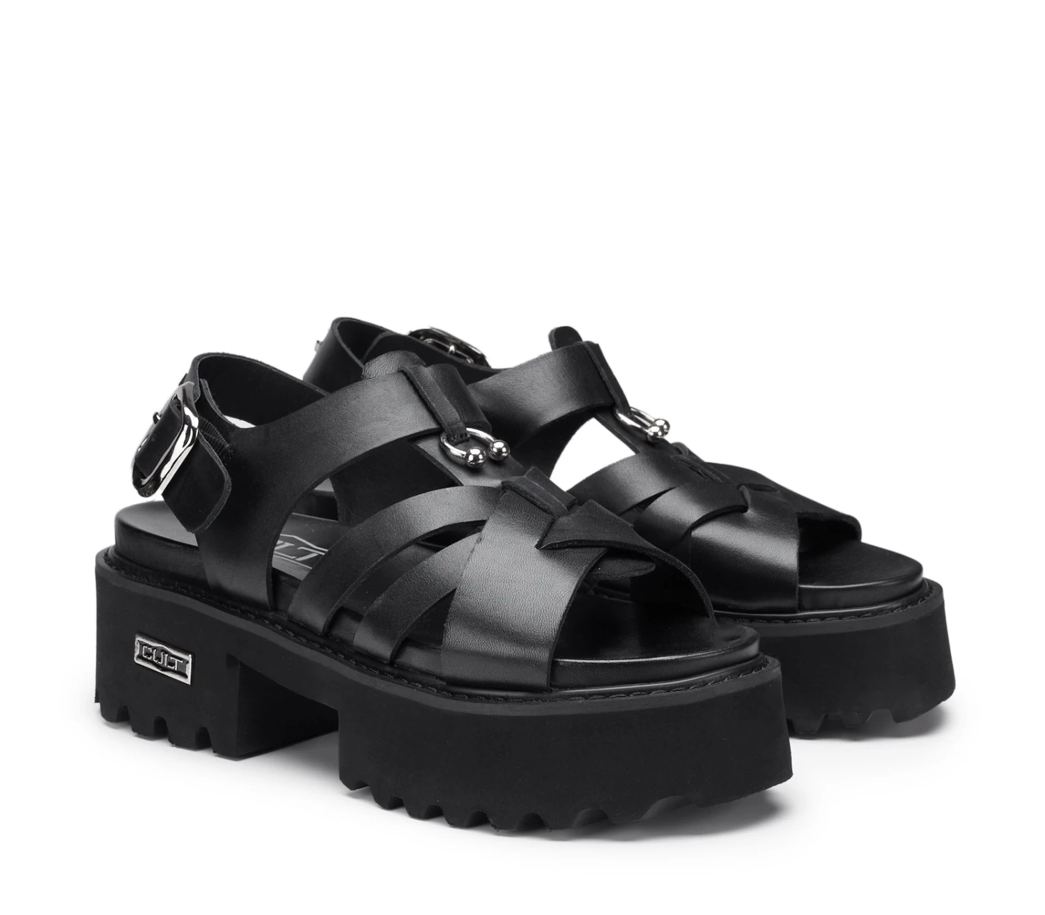 Sandalo CULT dallo stile grintoso con suola carrarmato, fasce in pelle color nero e dettaglio piercing sulla parte superiore. La chiusura con fibbia in metallo garantisce una regolazione sicura e un ulteriore elemento estetico in linea con l’anima glam-rock del brand.