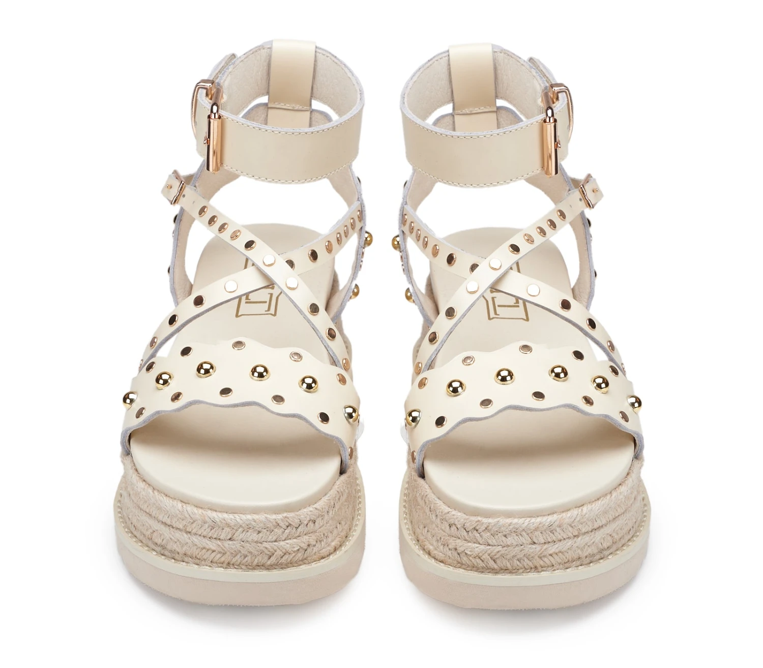 Un abbraccio d’estate ai tuoi passi: il sandalo CULT modello DOJA combina eleganza e audacia, con borchie dorate che danzano sulla pelle color panna. La zeppain corda intrecciata richiama il sole e la sabbia, mentre le fibbie luminose sussurrano storie di avventure estive. Un sogno boho-chic da indossare.