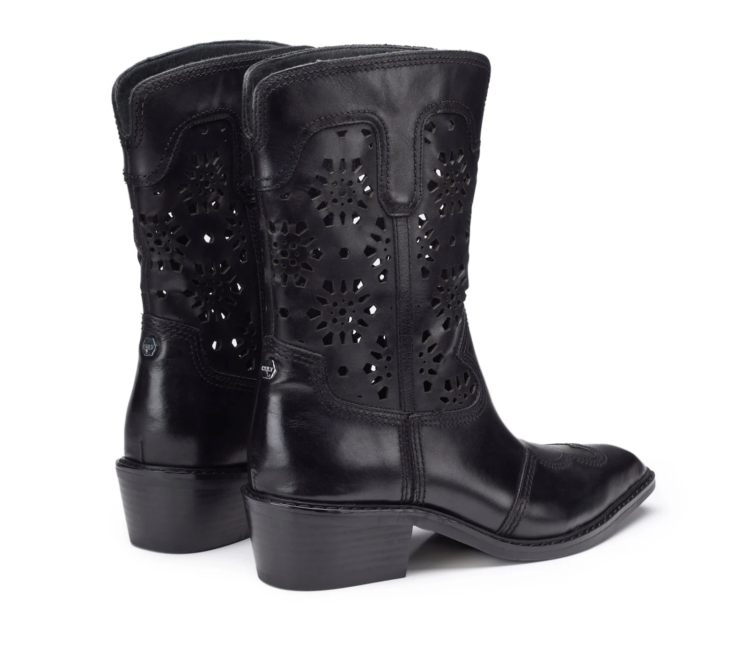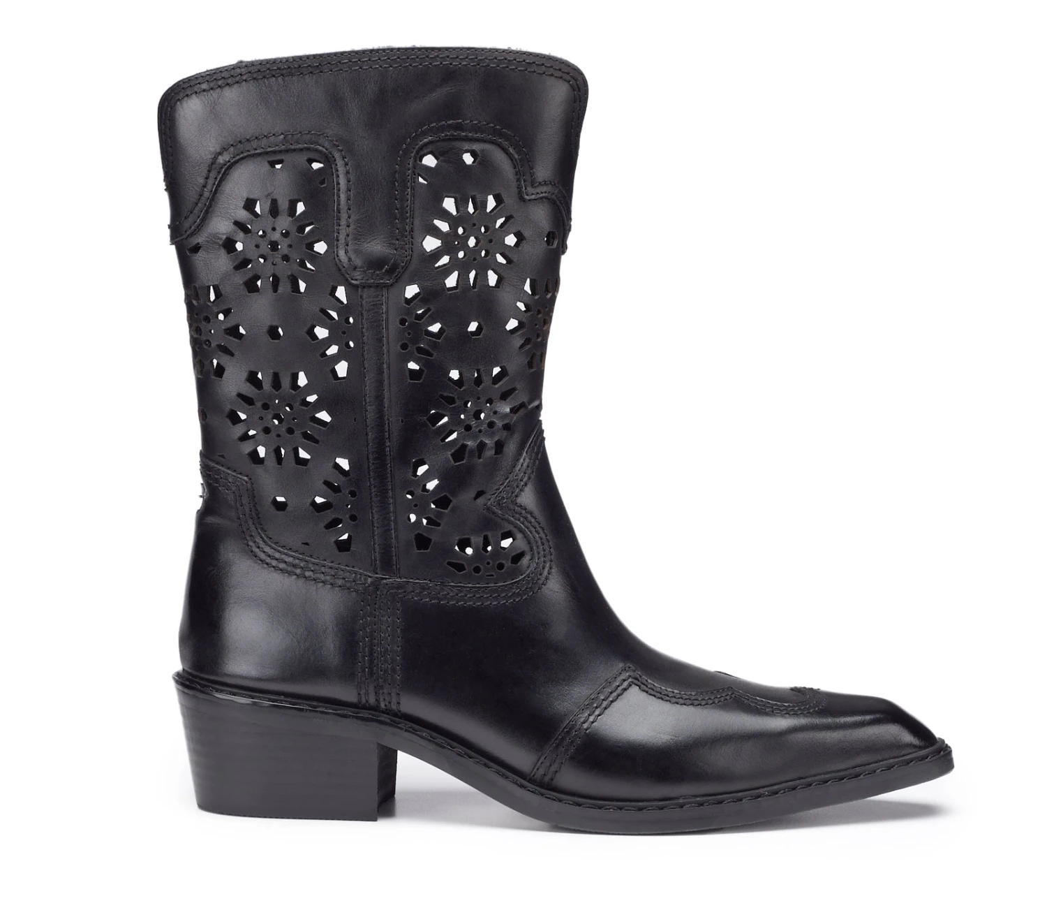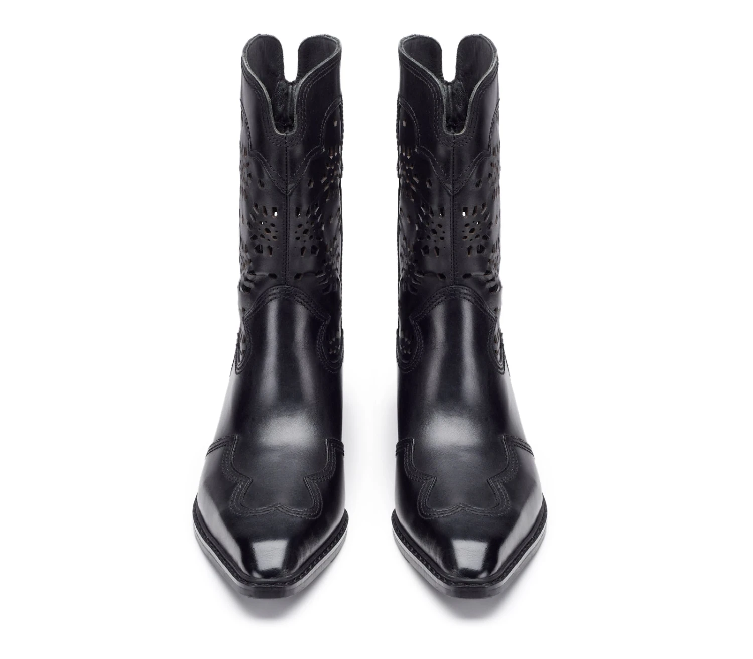 Lo stivale texano DOLORES di CULT in versione estiva è un must-have cool e contemporaneo. Caratterizzato da una lavorazione traforata unisce stile e artigianalità, creando un look audace e raffinato allo stesso tempo. Realizzato in vera pelle di color nero, è perfetto per aggiungere un tocco rock e sofisticato a qualsiasi outfit.