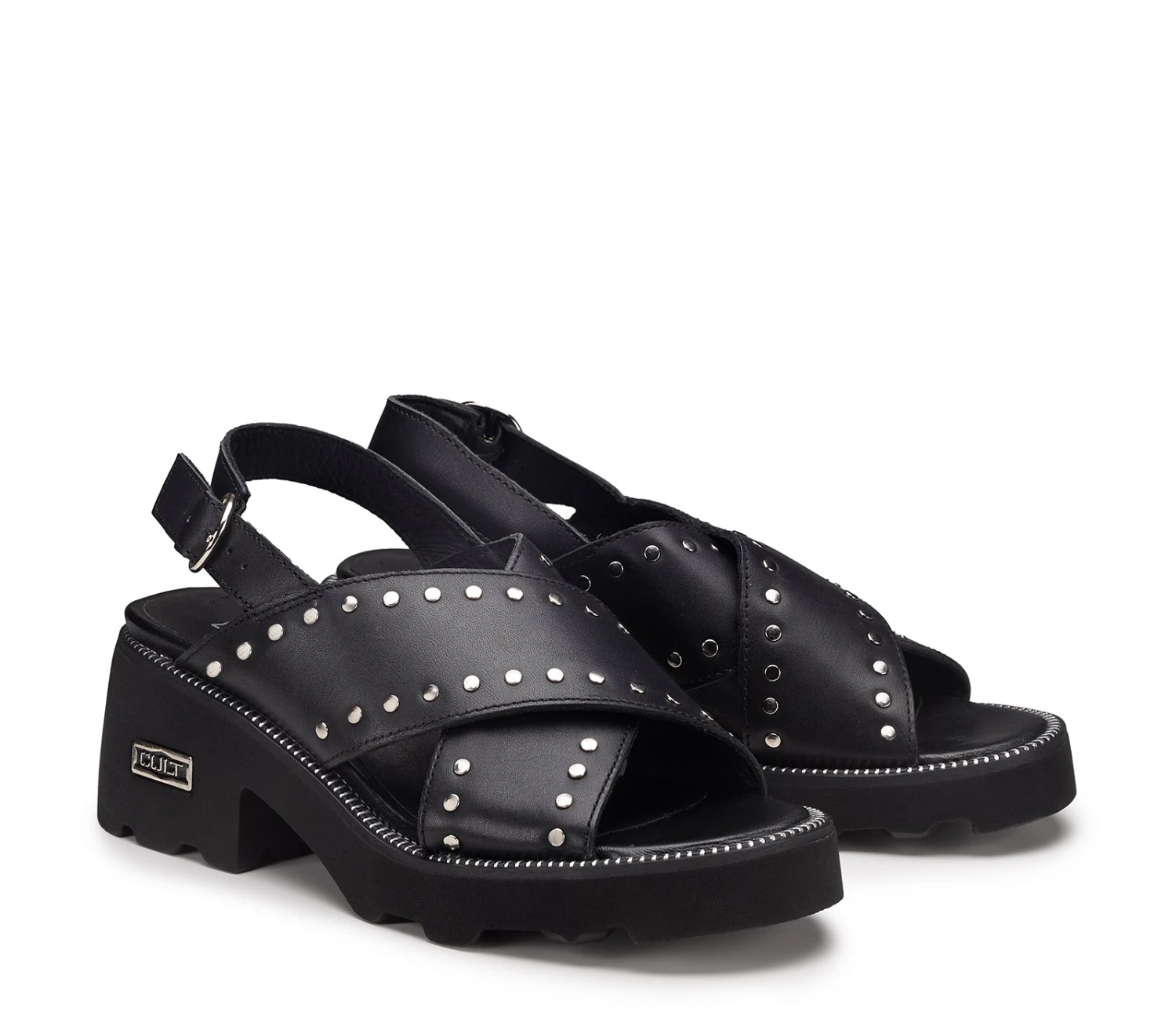 Questi sandali in pelle nera firmati Cult presentano una generosa suola in gomma, due larghe fasce in pelle che si incrociano, decorate con borchie metalliche e una chiusura con fibbia per una vestibilità sicura. Offrono un look audace e stiloso, perfetto per aggiungere un tocco di carattere ai tuoi outfit estivi.
