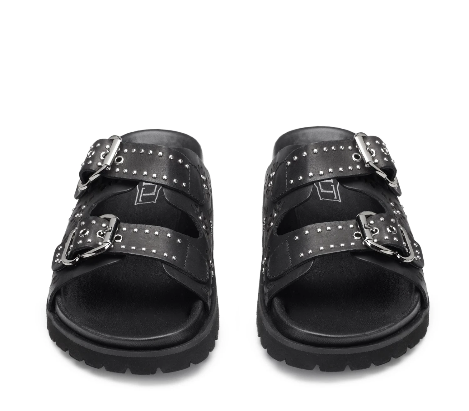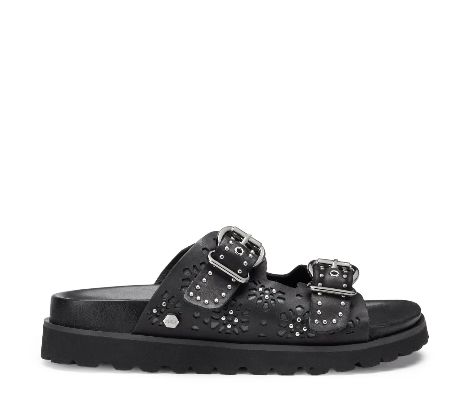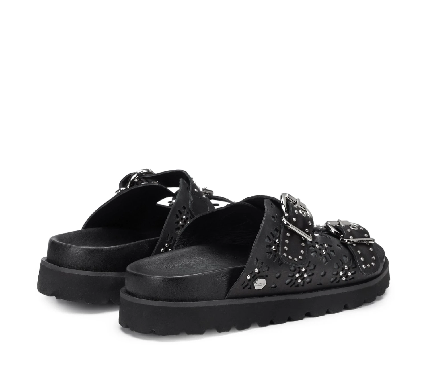 L’eleganza prende forma a ogni passo con i nuovi sandali Lizzo total black firmati CULT. Realizzati in morbida pelle nera a lavozione traforata con disegno floreale, presentano due ampie fasce impreziosite da mini eyelet, micro studs e fibbie metalliche. Poggiano su un footbed rivestito in pelle con suola chunky dentellata.