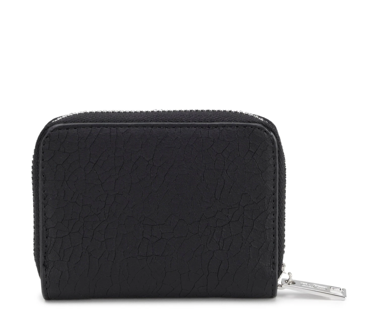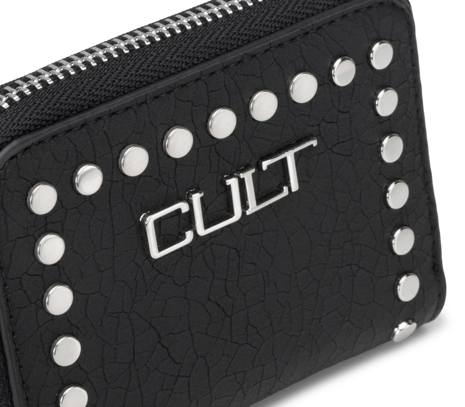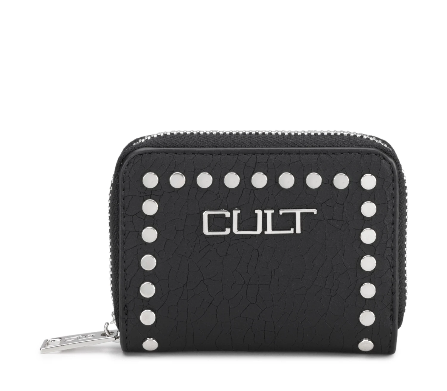 Portafoglio firmato Cult realizzato in ecopelle nera è impreziosito da borchie piatte e logo lettering nella parte frontale. Al suo interno sono presenti due scomparti per organizzare banconote, tessere e monete. La chiusura è tramite zip metallica. Dimensioni 10,5x8x2