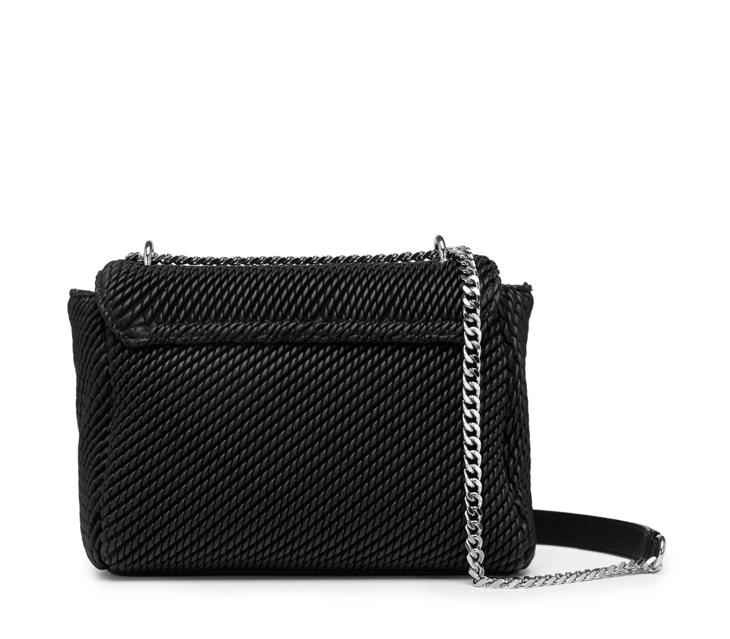 La nuova mini tracolla con patta SHERYL in ecopelle nera con lavorazione a effetto intrecciato firmata CULT, si distingue sia per la sua linea minimal sia per il suo look elegante e glam-rock. I dettagli metallici come il logo lettering del brand e il manico a catena con borchie color silver, aggiungono al design un elemento di stile. Perfetta per chi cerca un accessorio di tendenza, dal gusto contemporaneo. Dimensioni: 25x17x10.