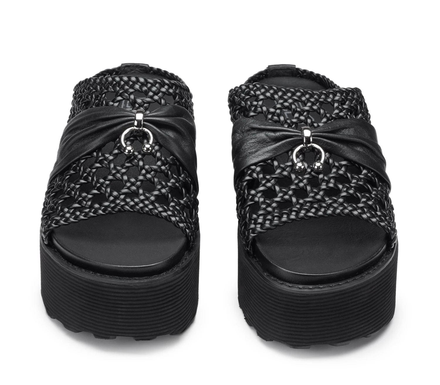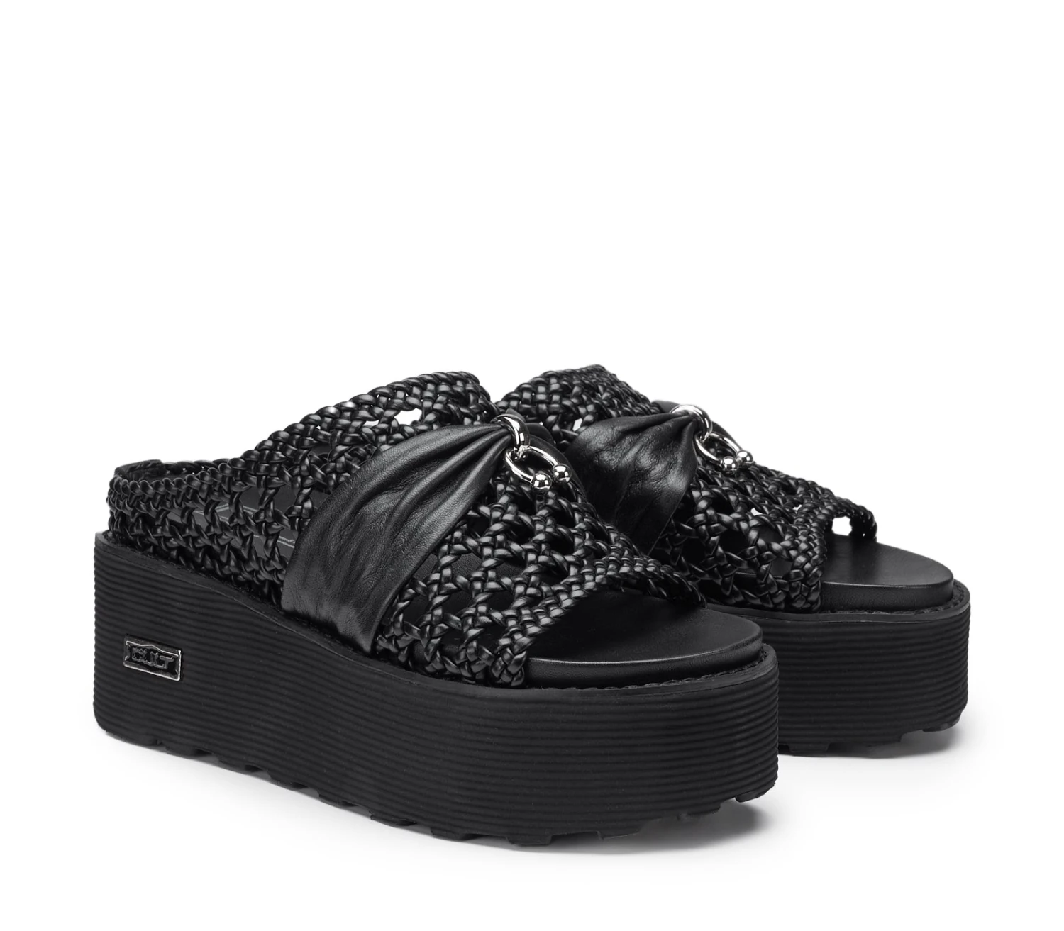 Vero must-have di questa stagione, i sandali firmati CULT poggiano su una suola platform e sono assicurati da una maxi fascia in pelle nera traforata arricchita da un fiocco in nappa e piercing metallico. Contemporanei e minimal, saranno un successo assicurato con shorts, maxi dress estivi e bluse colorate.