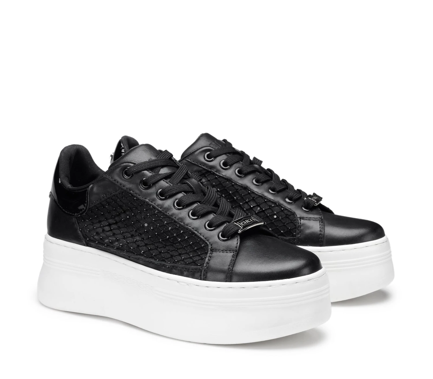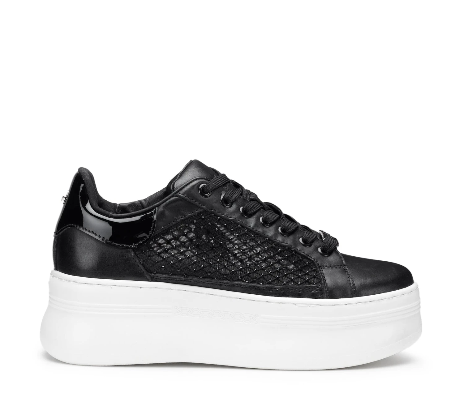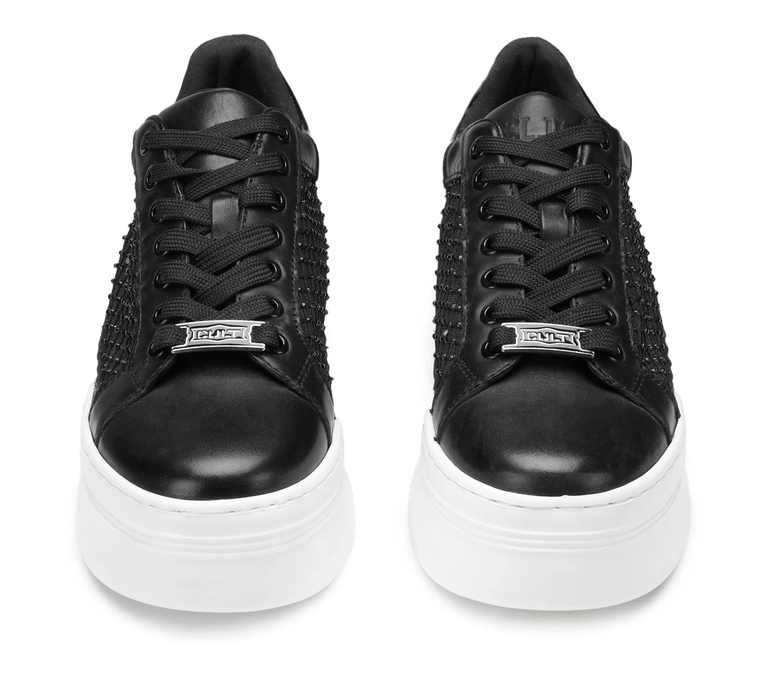 Black & white per queste nuove sneakers PEARL in pelle nera, firmate CULT Lacci sur ton e tomaia in pelle e rete mesh, abbellita da strass neri che le rende grintose e femminili allo stesso tempo, per un effetto davvero glam-rock. La loro silhouette offre infinite possibilità di abbinamento. Suola in gomma a contrasto color bianco.