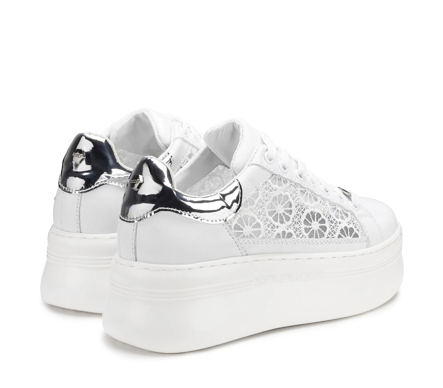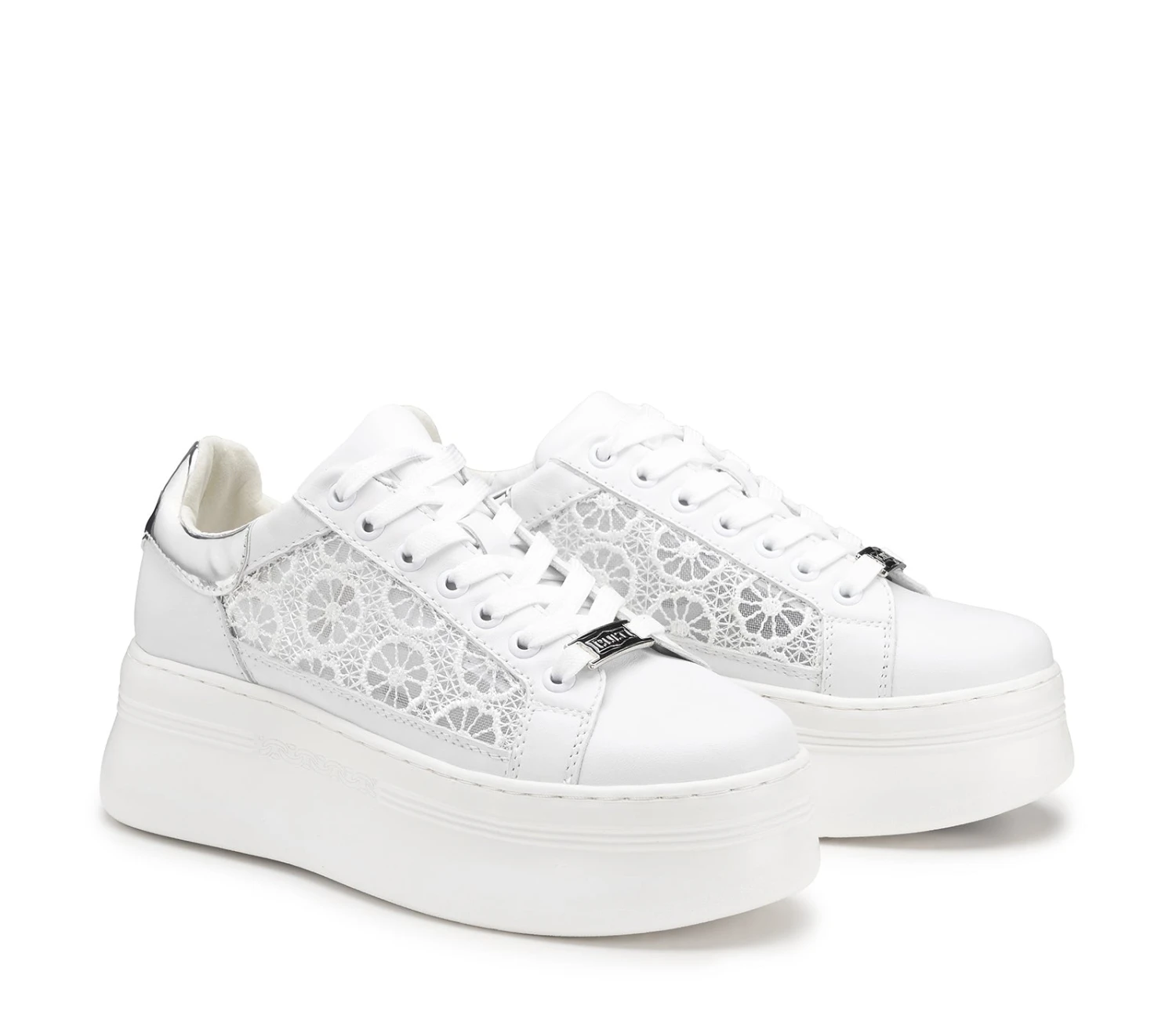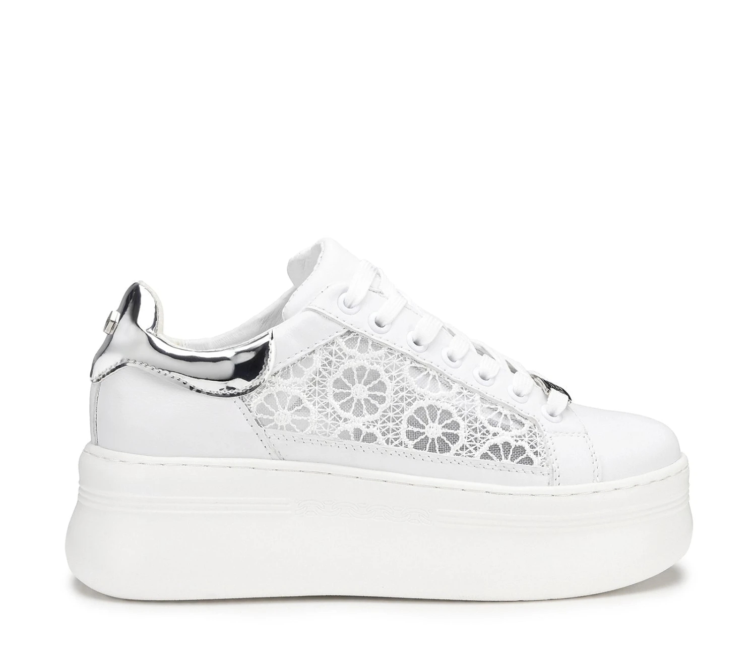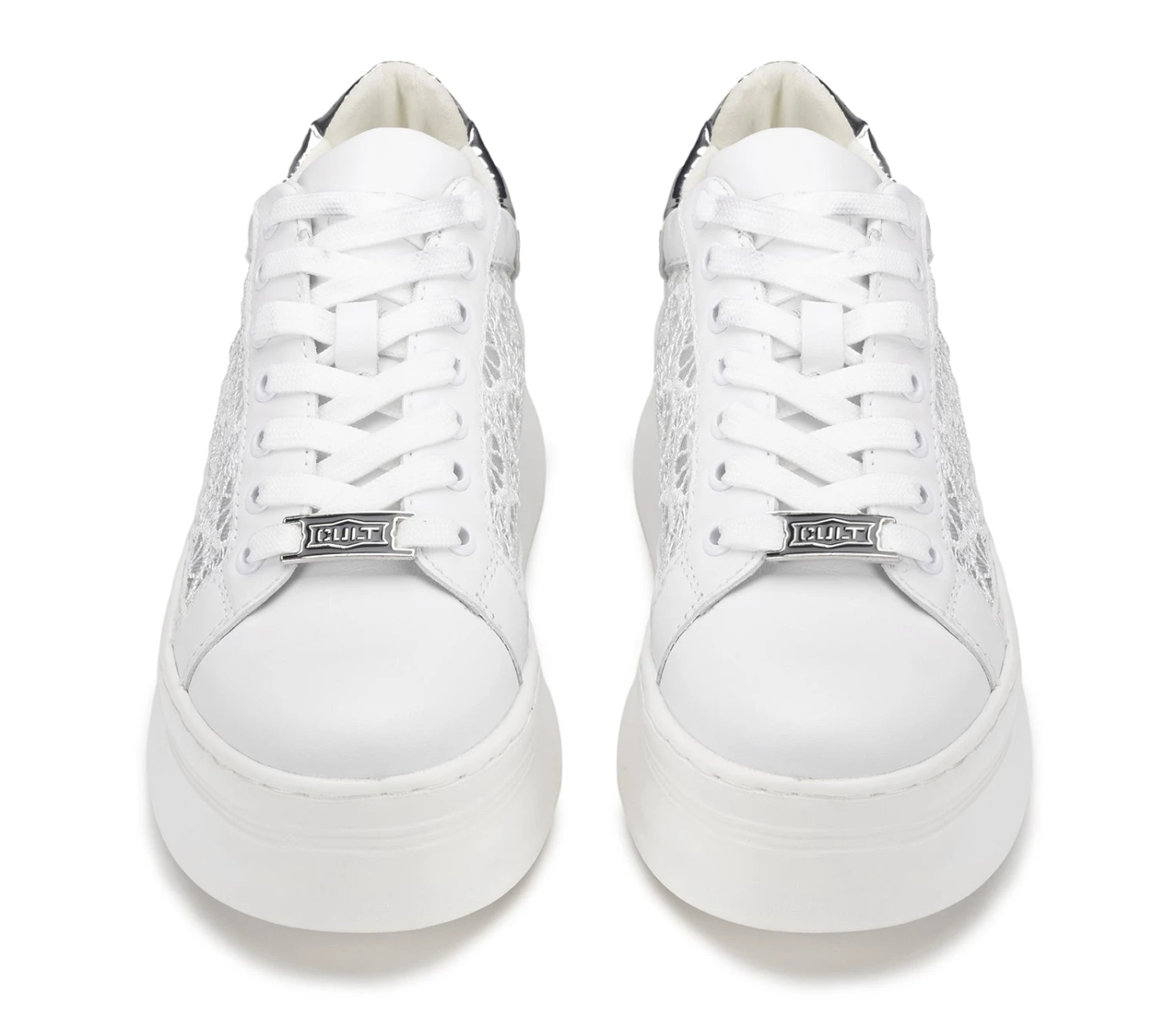 Total white per queste nuove sneakers PEARL in pelle, firmate CULT. Lacci sur ton, contrafforte in argento metallizzato e forature floreali in mesh/lace, per un look grintoso e femminile allo stesso tempo in perfetto stile glam-rock. La loro silhouette offre infinite possibilità di abbinamento.