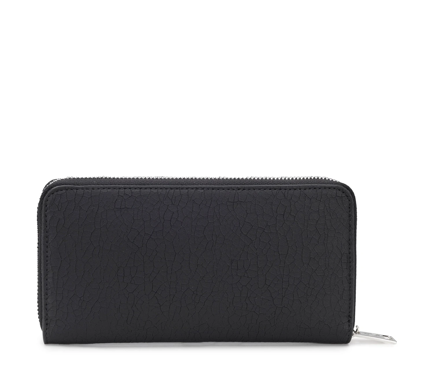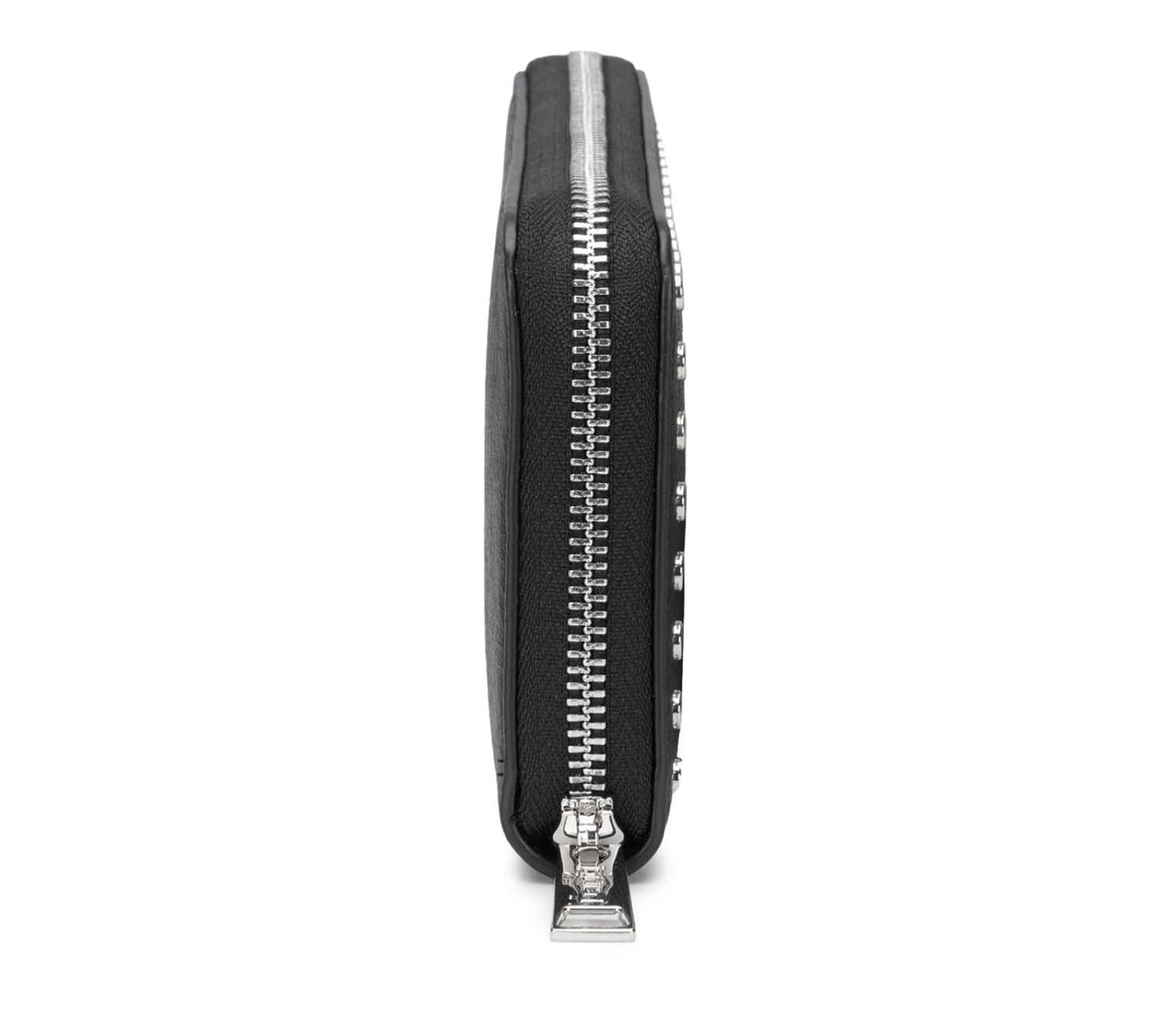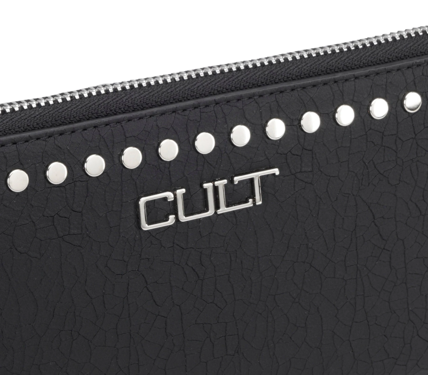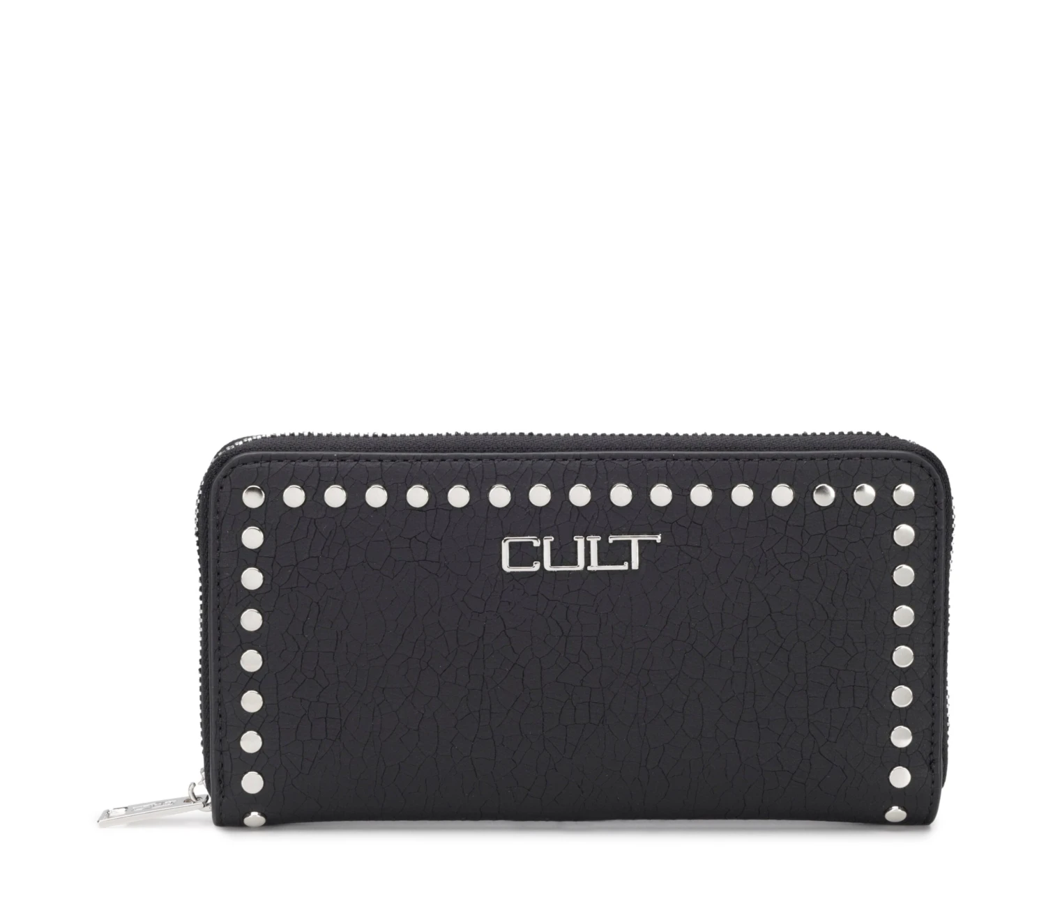Portafoglio firmato Cult realizzato in ecopelle nera è impreziosito da borchie piatte e logo lettering nella parte frontale. Al suo interno sono presenti due scomparti per organizzare banconote, tessere e monete. La chiusura è tramite zip metallica. Dimensioni 19,5x10x2,5
