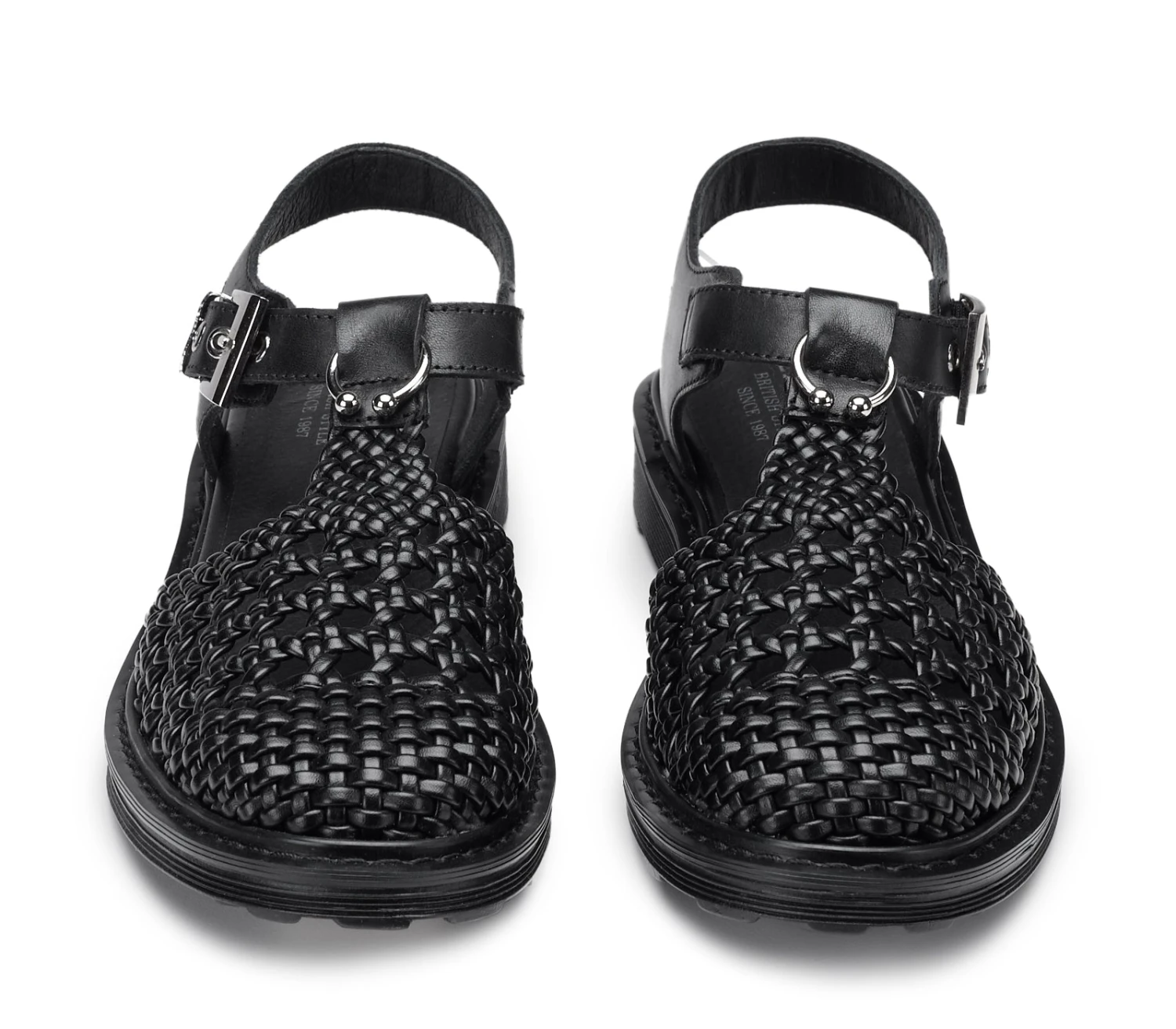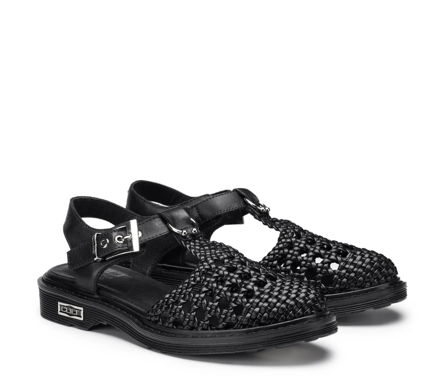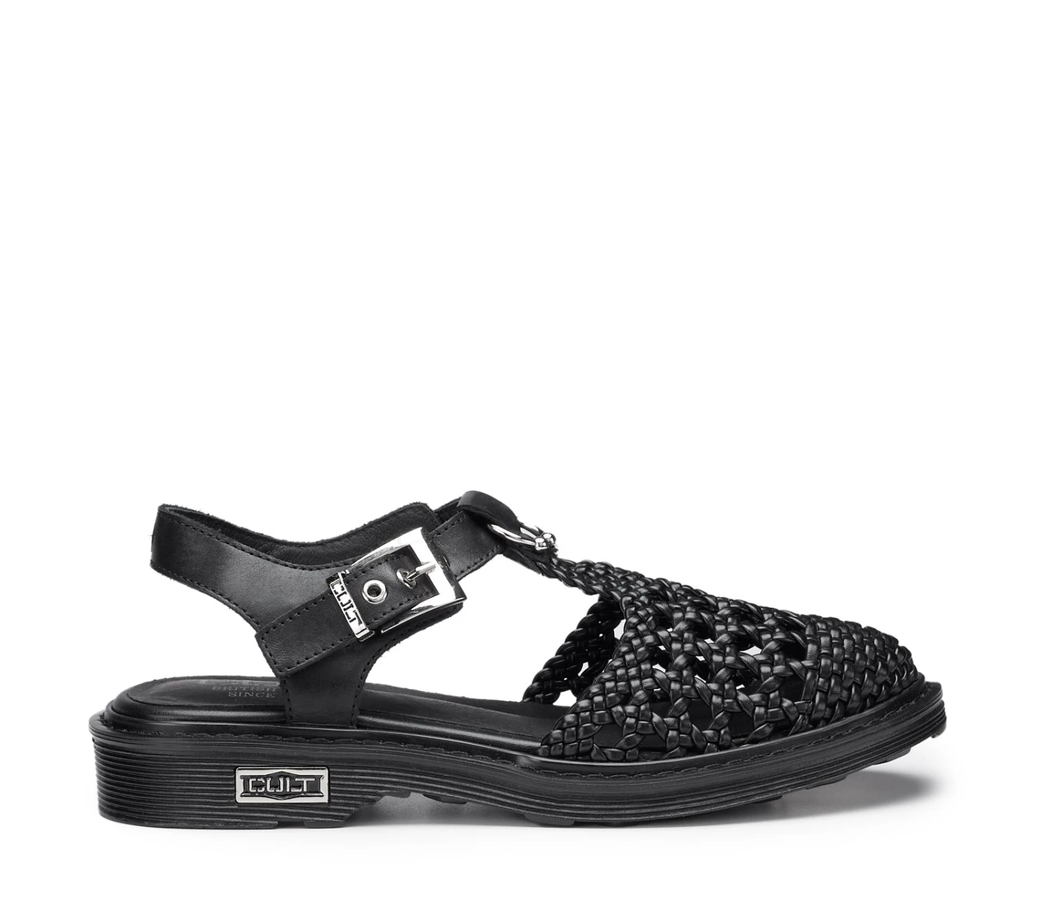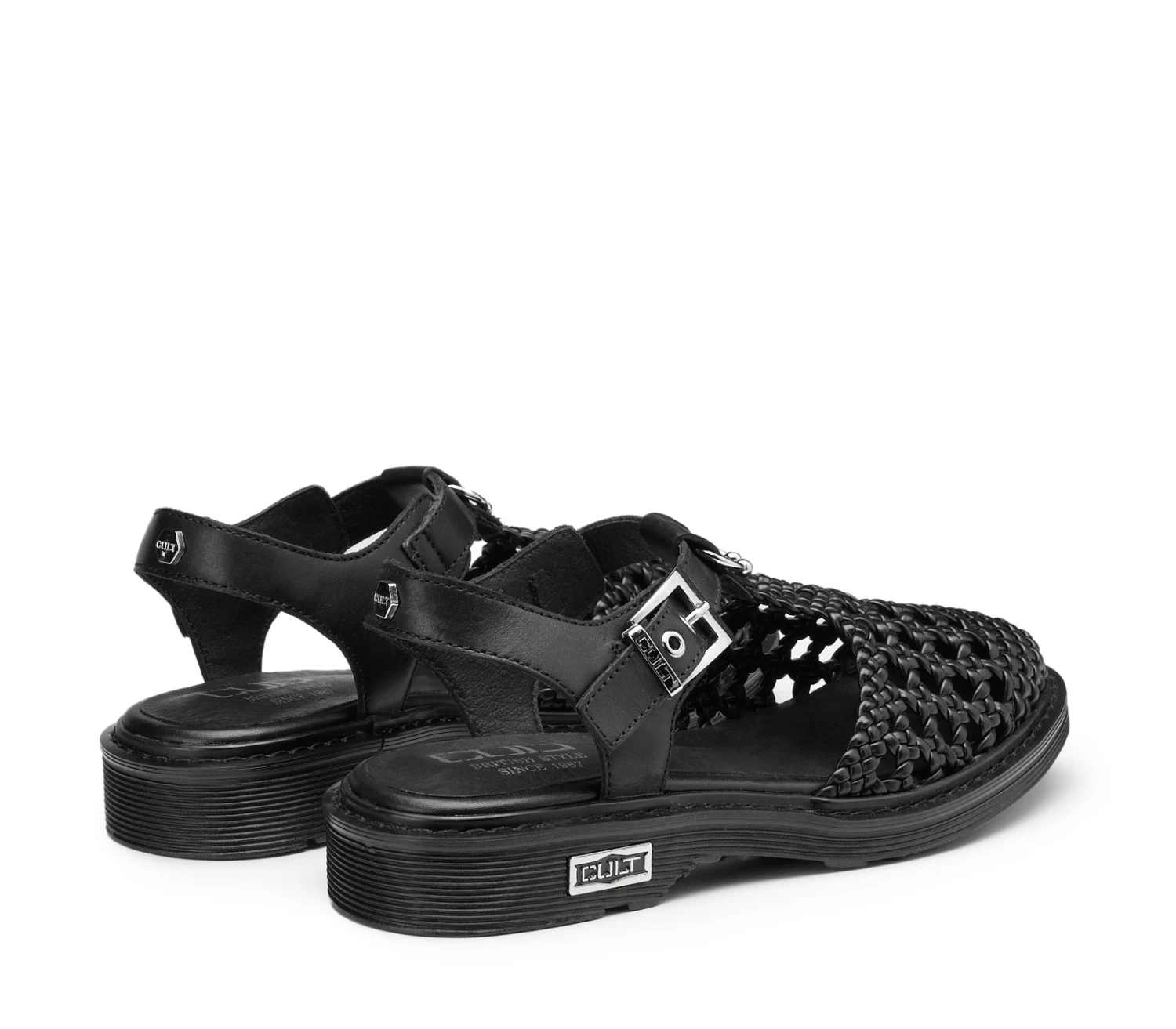 Cool ed eleganti questi nuovi sandali in pelle chiusi sul davanti della famiglia SABBATH firmati Cult per la stagione primavera/estate. La tomaia sfoderata in pelle intrecciata nera dona un tocco in più ai vostri outfit. I dettagli metallici come il piercing sulla fascia in pelle e la targa metallica sulla suola donano un accento grintoso ai vostri look. Presentano inoltre una moderna allacciatura laterale con fibbia metallica che aggiunge un ulteriore nota di stile e raffinatezza al loro design audace.