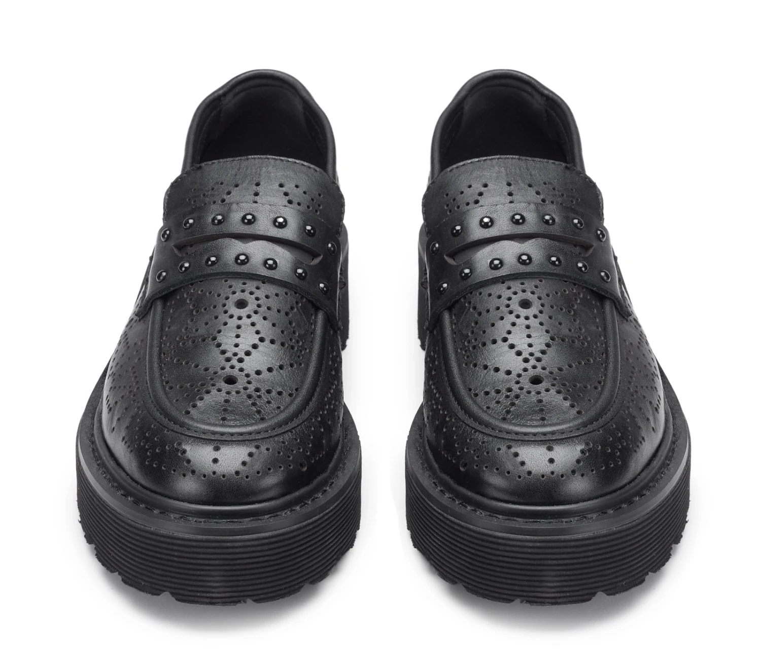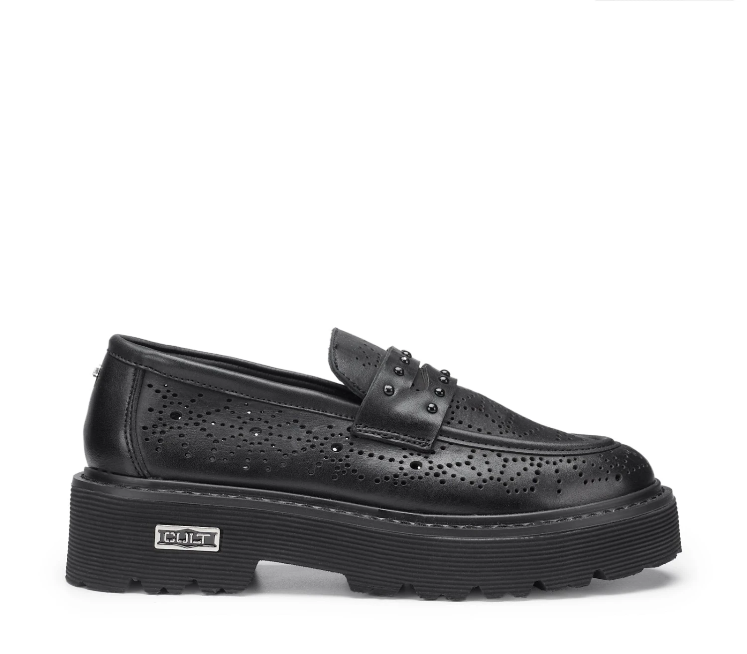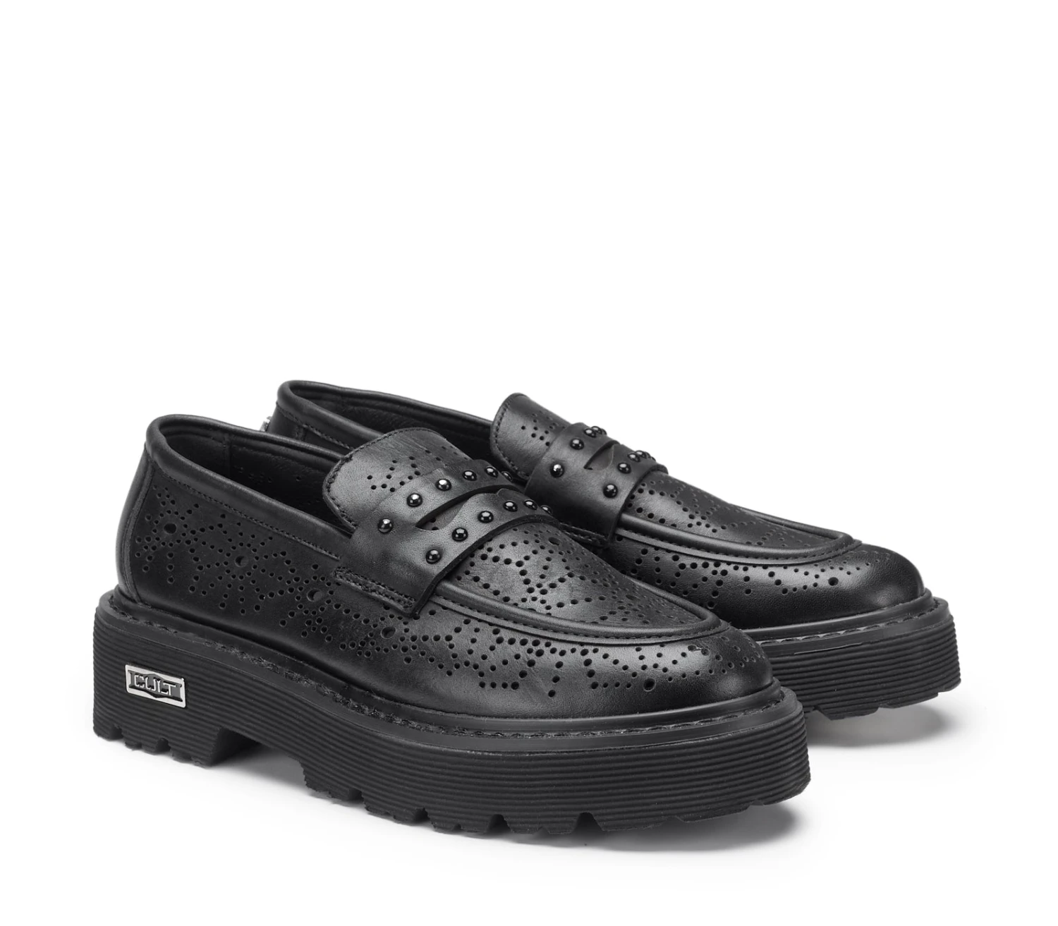 Spirito urbano e dettagli accattivanti si incontrano in questi mocassini estivi in pelle nera in pieno stile Cult, caratterizzati da forature floreali, gentili e femminili che richiamano la sensazione della bella stagione. Doneranno un tocco grintoso ai tuoi look casual anche grazie agli accenti metallici tono su tono sulla mascherina.