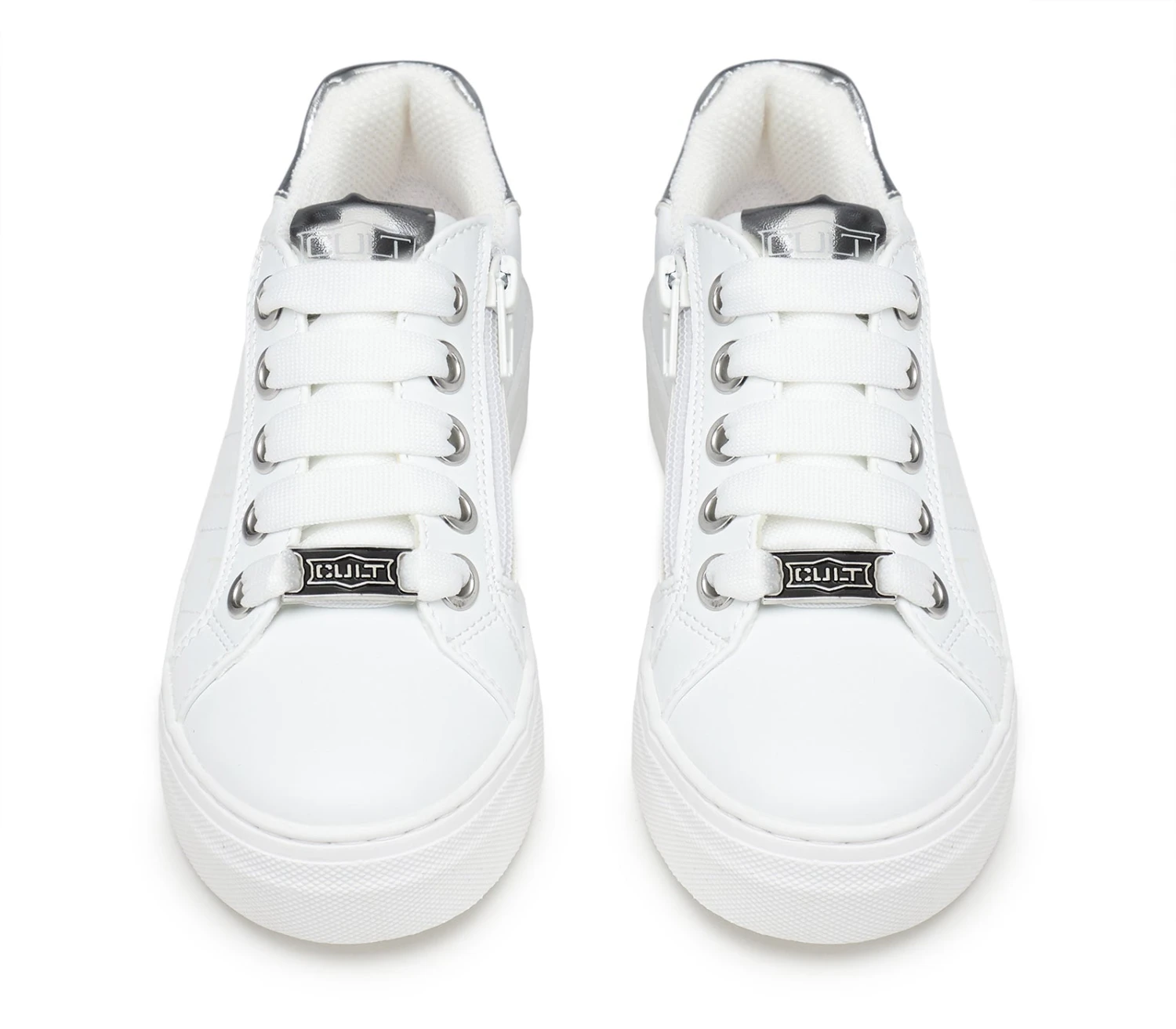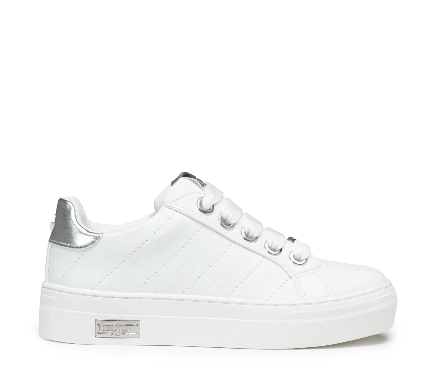 Le sneakers CULT Kids in tonalità beige con monogramma sono la scelta perfetta per chi ama un tocco raffinato e originale. Il motivo logato e le finiture dorate le rendono ideali per outfit eleganti ma anche casual.