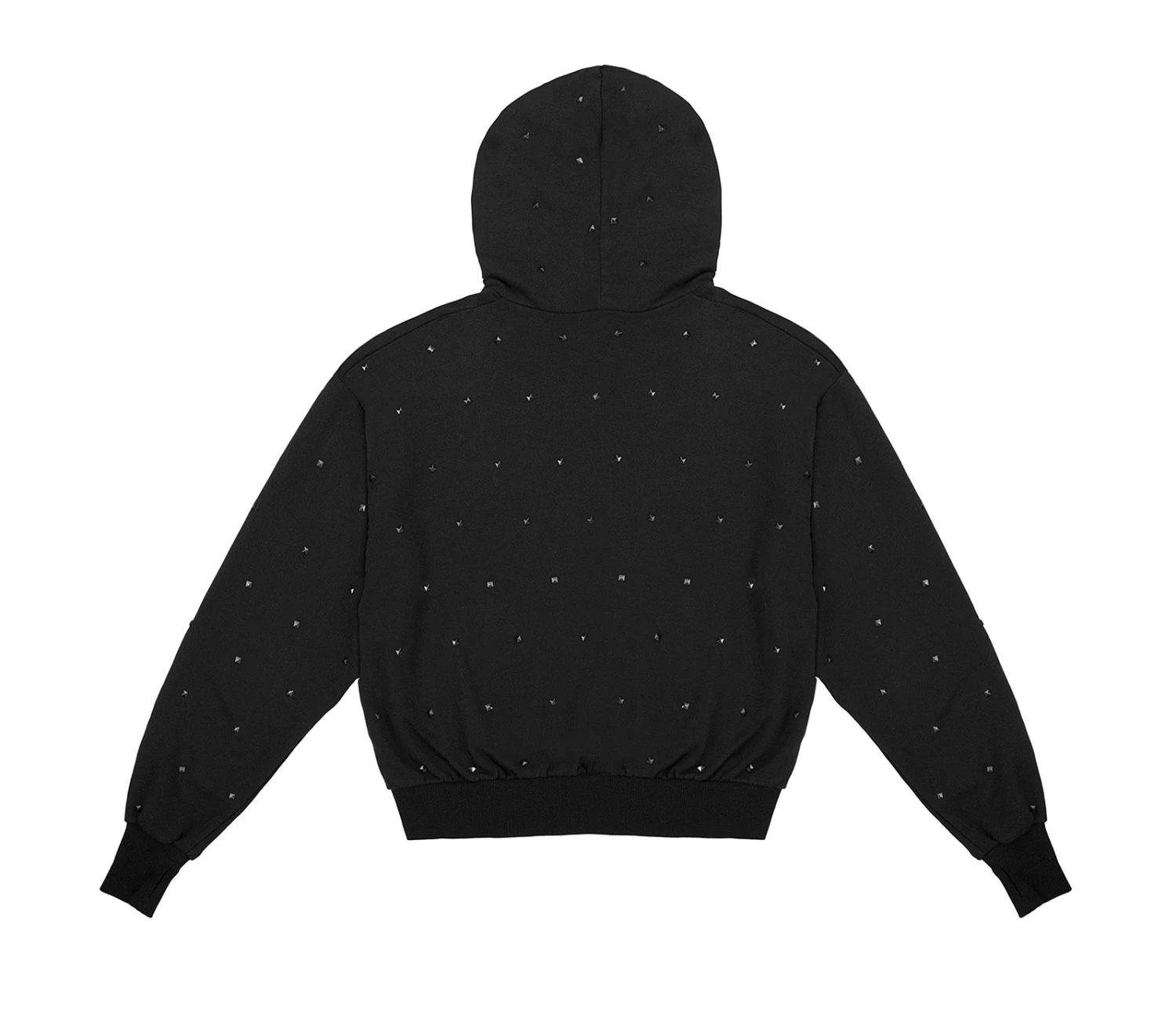 Felpa di Cult donna in cotone nero con borchie piramidali all over, collo tondo con cappuccio, polsini e fondo rifiniti a costine, maniche lunghe, linea boxy.