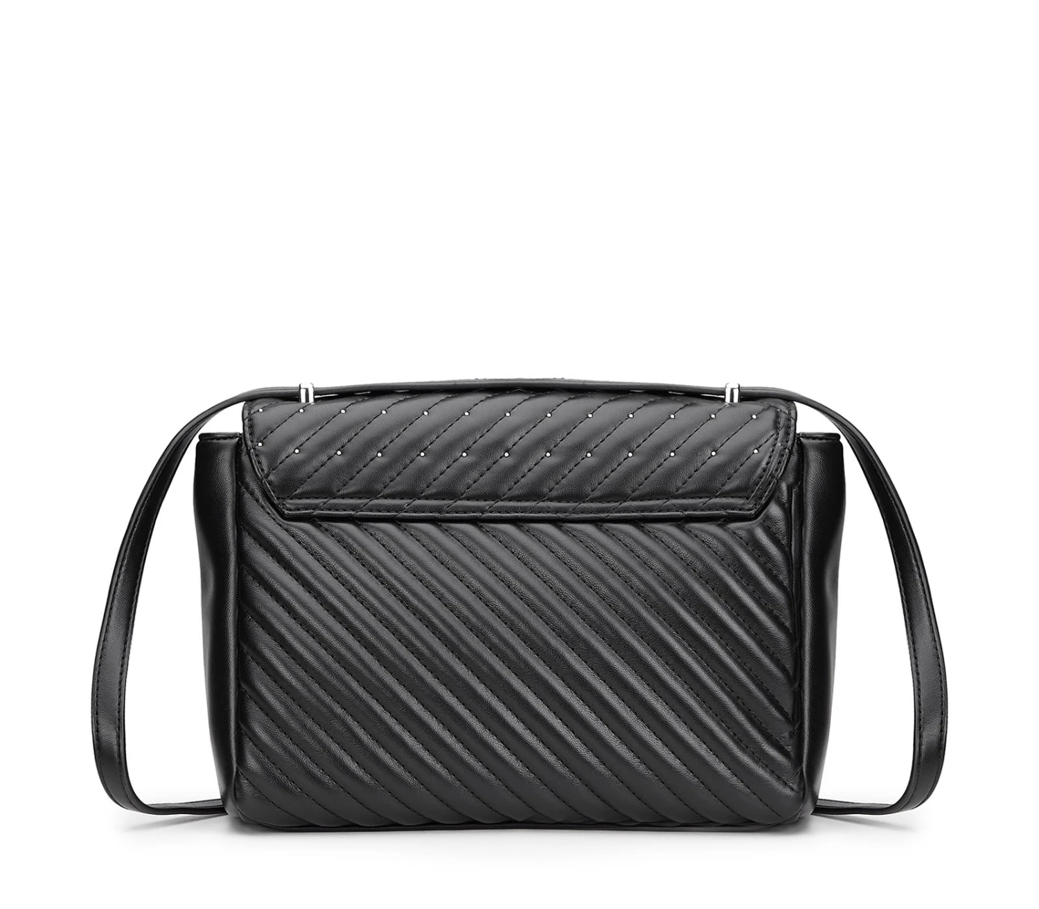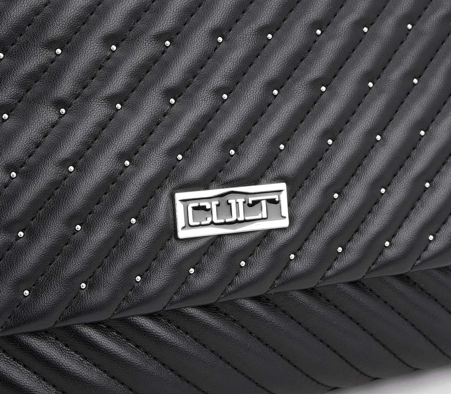 La borsa a tracolla di Cult è una compagna sofisticata di giorno e di sera. Modello dalla silhouette morbida in ecopelle nera matelassé impreziosita da micro borchie sferiche sulla patta è dotato di una tracolla regolabile. Grazie al suo stile intramontabile e all’iconico logo Cult in metallo, eleverà qualsiasi look con eleganza impareggiabile. Dimensioni 24x17x7, chiusura magnetica