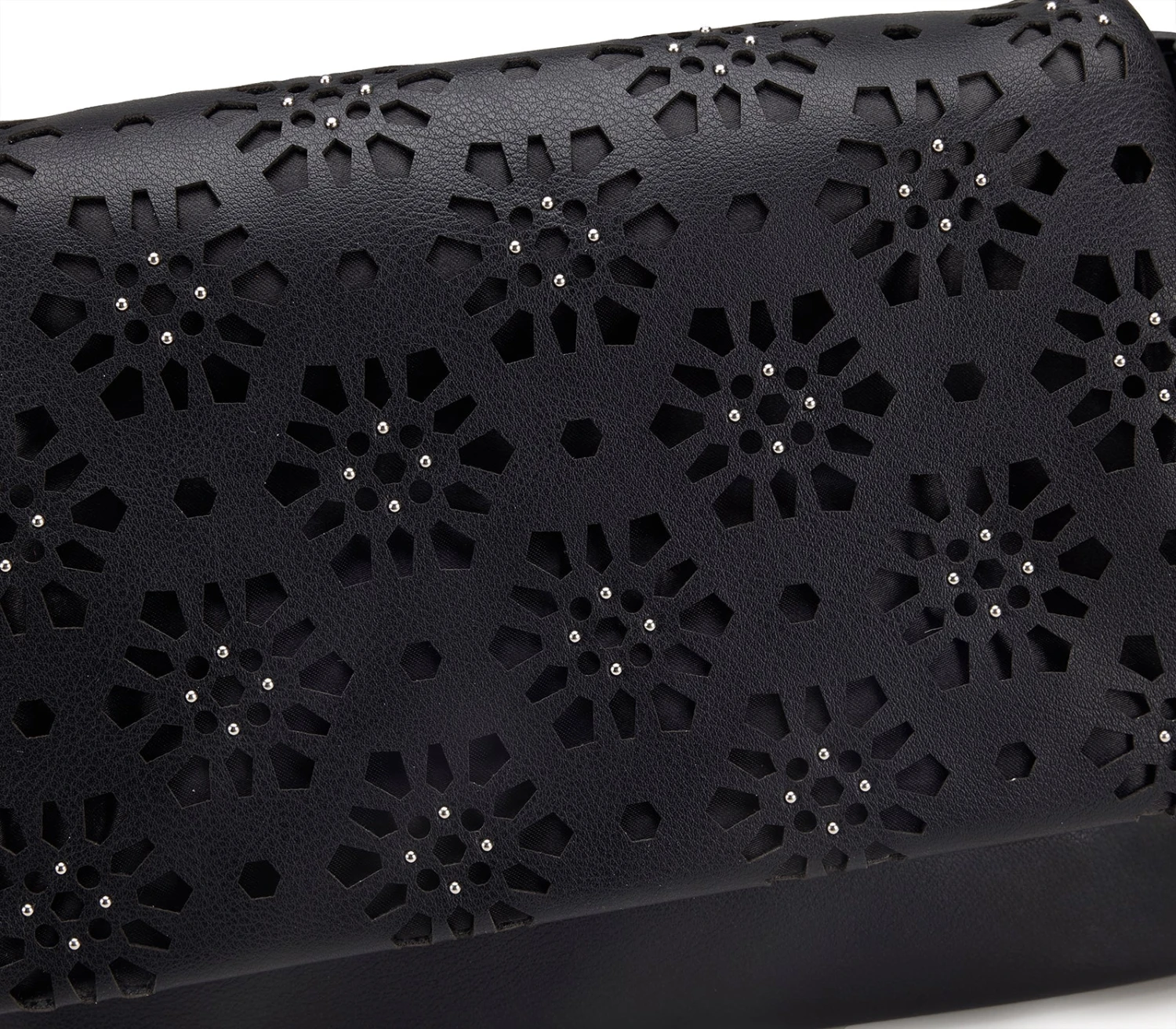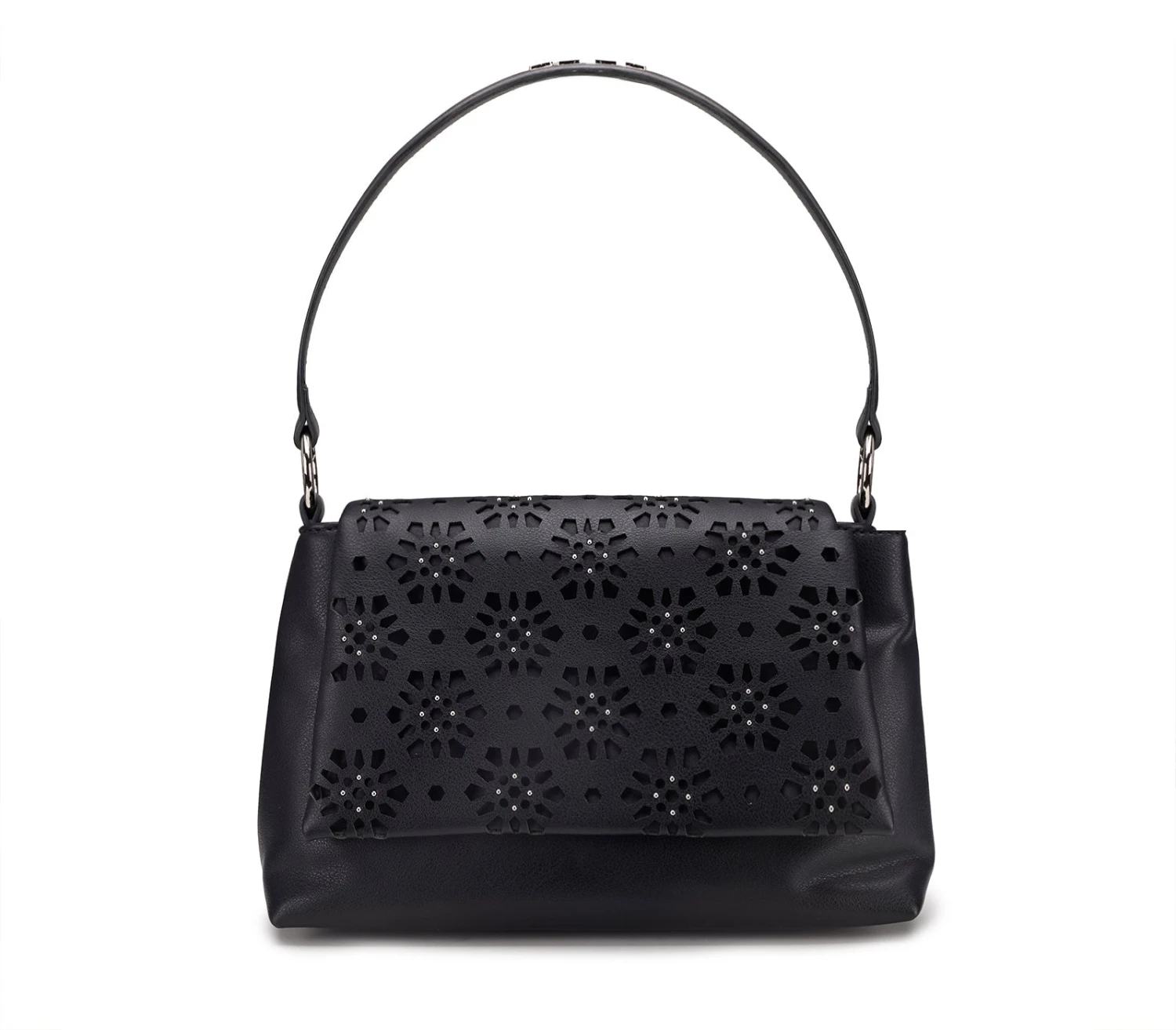 La nuova flap bag NINA in ecopelle nera firmata CULT, pensata per la stagione primavera-estate 2025, unisce eleganza e carattere. Arricchita da mini borchie bubble in metallo color argento, dettagli floreali cut-out e il logo lettering del brand, questa borsa aggiunge un tocco decisamente glam-rock al tuo look. Un vero must-have per non passare inosservata. Dimensioni: 24x16x9.