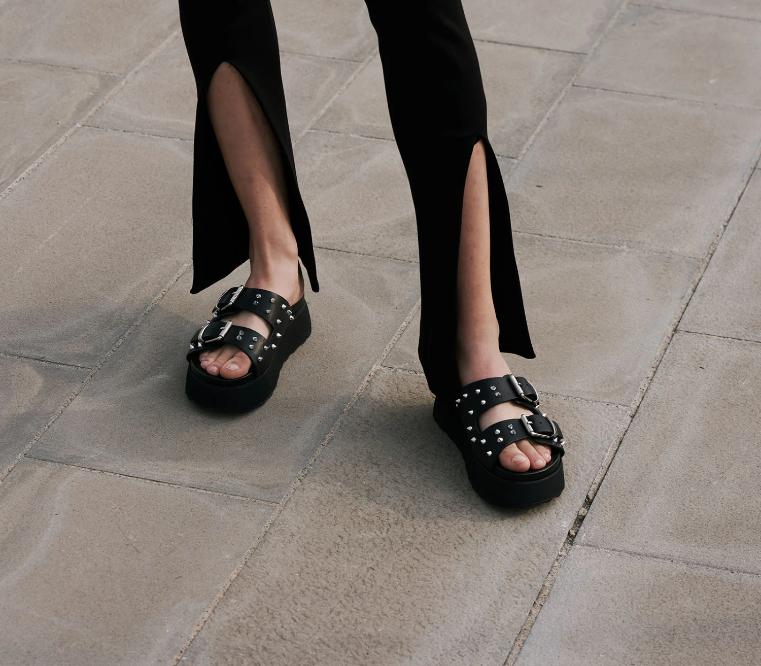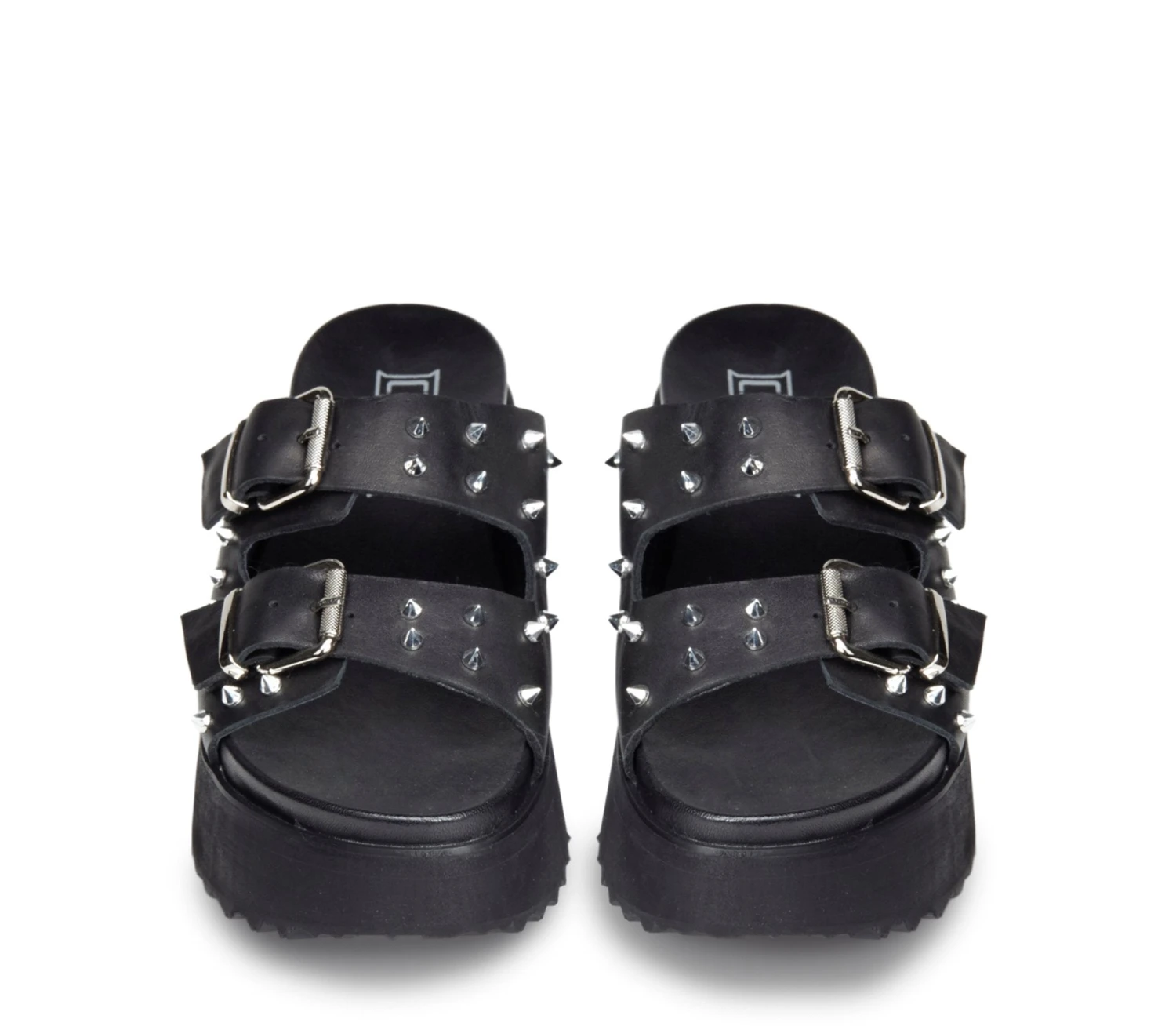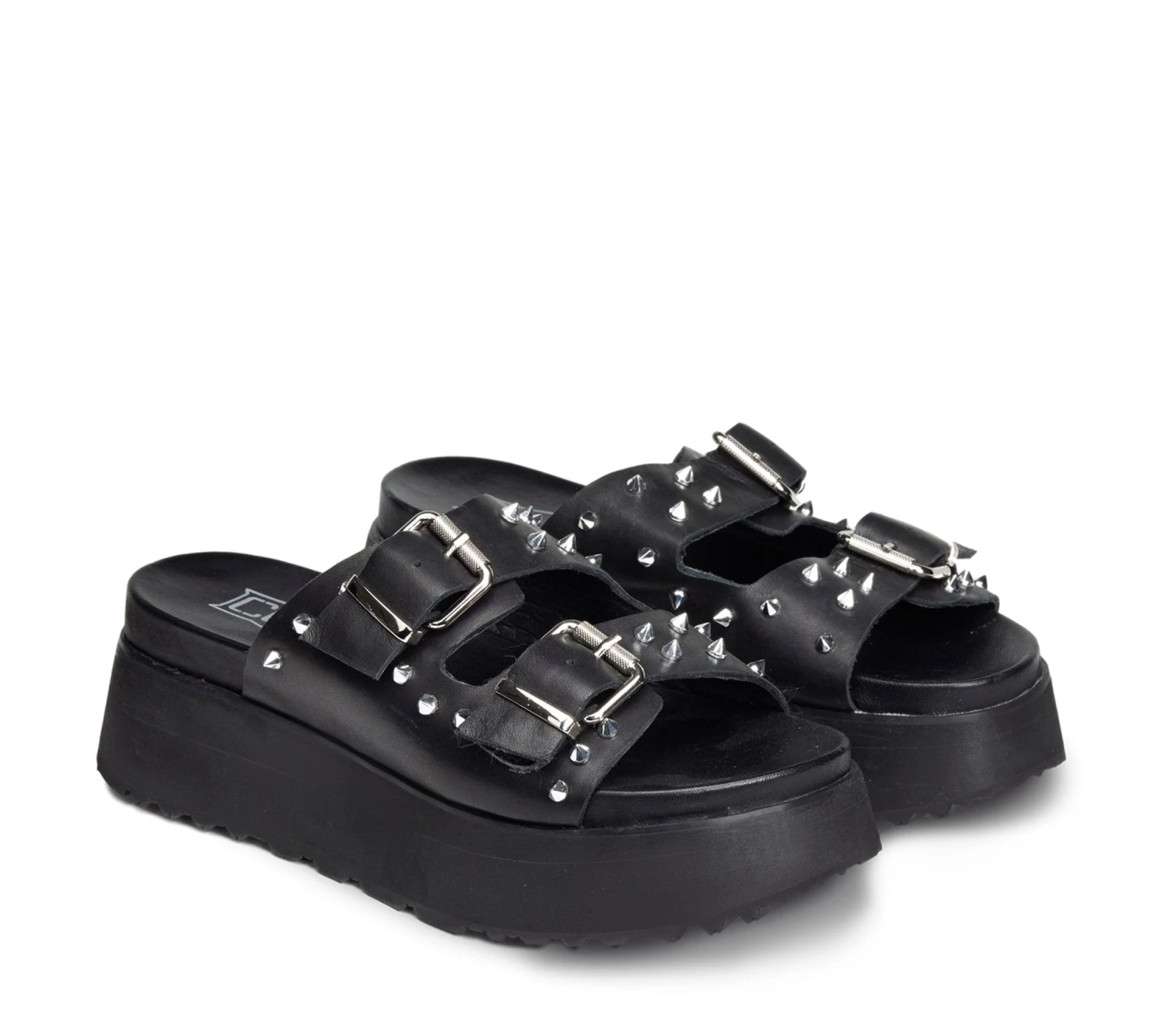 Attuali ma senza mai rinunciare alla propria anima rock questi sandali firmati Cult per l’estate 2025. Due fasce in pelle nera impreziosite da fibbie e borchie spike in metallo e suola platform per questi sandali da abbinare ad ogni outfit per un tocco decisamente glam rock.