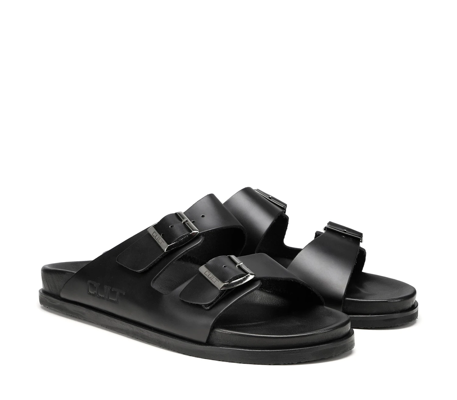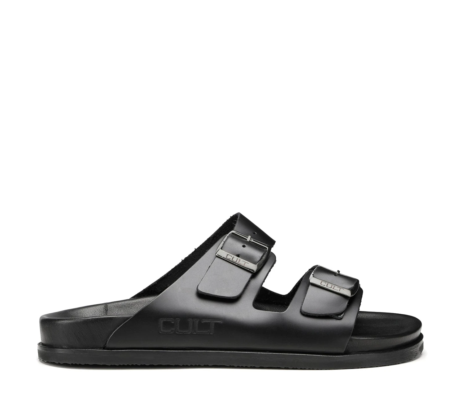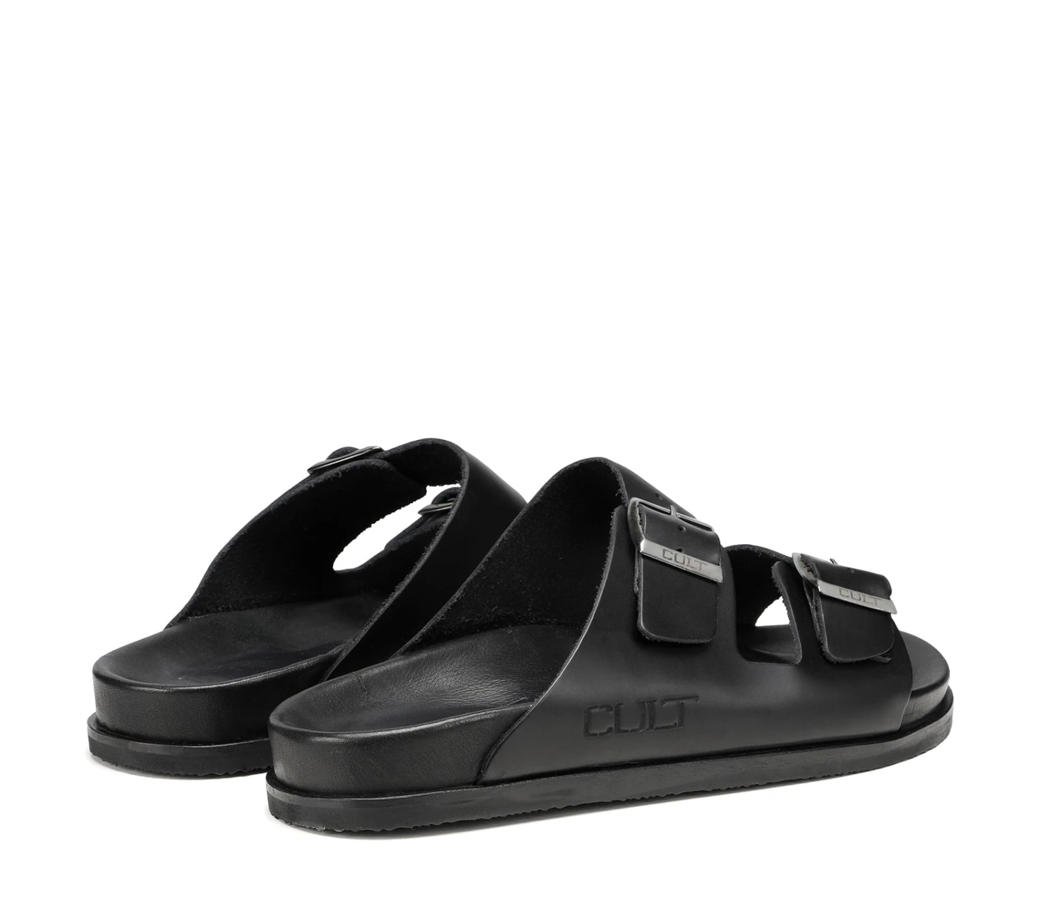 Un vero must estivo, i sandali firmati Cult realizzati per la bella stagione sono moderni e pratici. Appoggiati su una comoda suola in gomma, sono assicurati da due fasce in pelle nera con fibbie tono-su-tono.