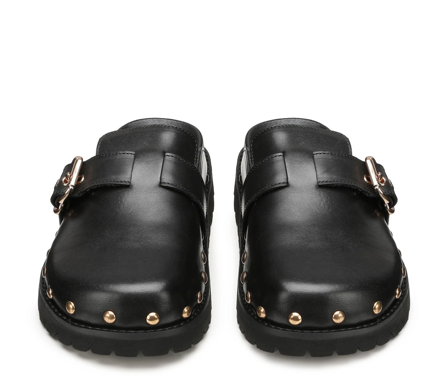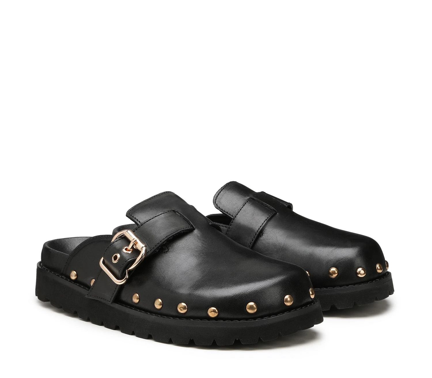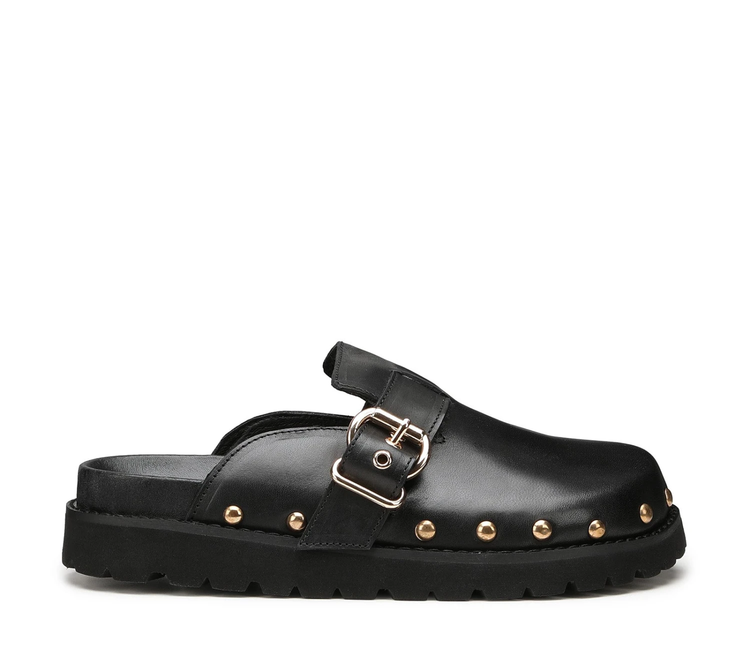 Puntate su Cult per delle scarpe di grande effetto come queste sabot: sono caratterizzate da linee pulite, presentano la tomaia in pelle nera liscia e sono rifinite con borchie sferiche per un effetto zoccolo e fibbie metalliche color oro. Promettono massima comodità da mattina a sera grazie al footbed rivestito in pelle con suola platform e al design basso.