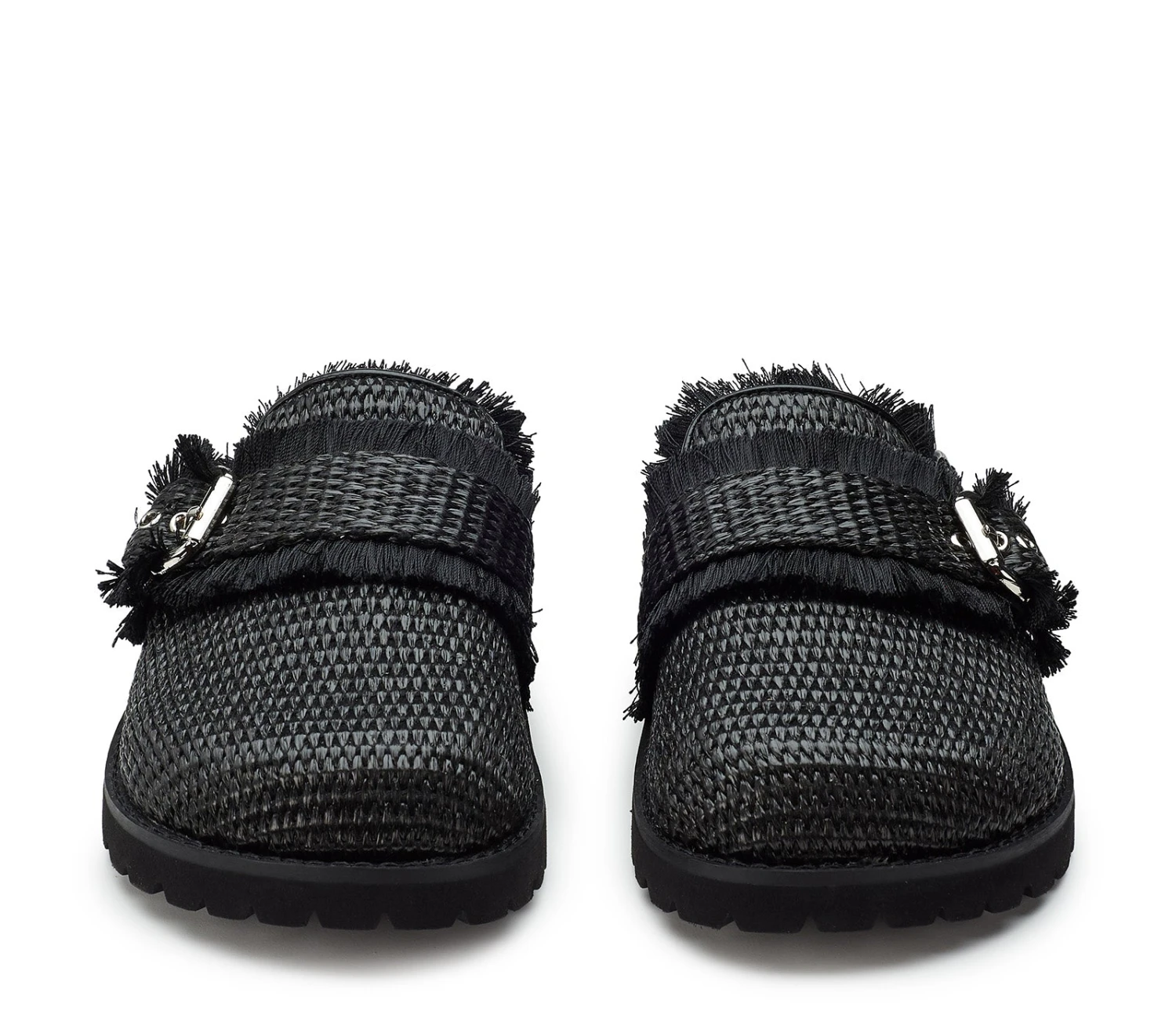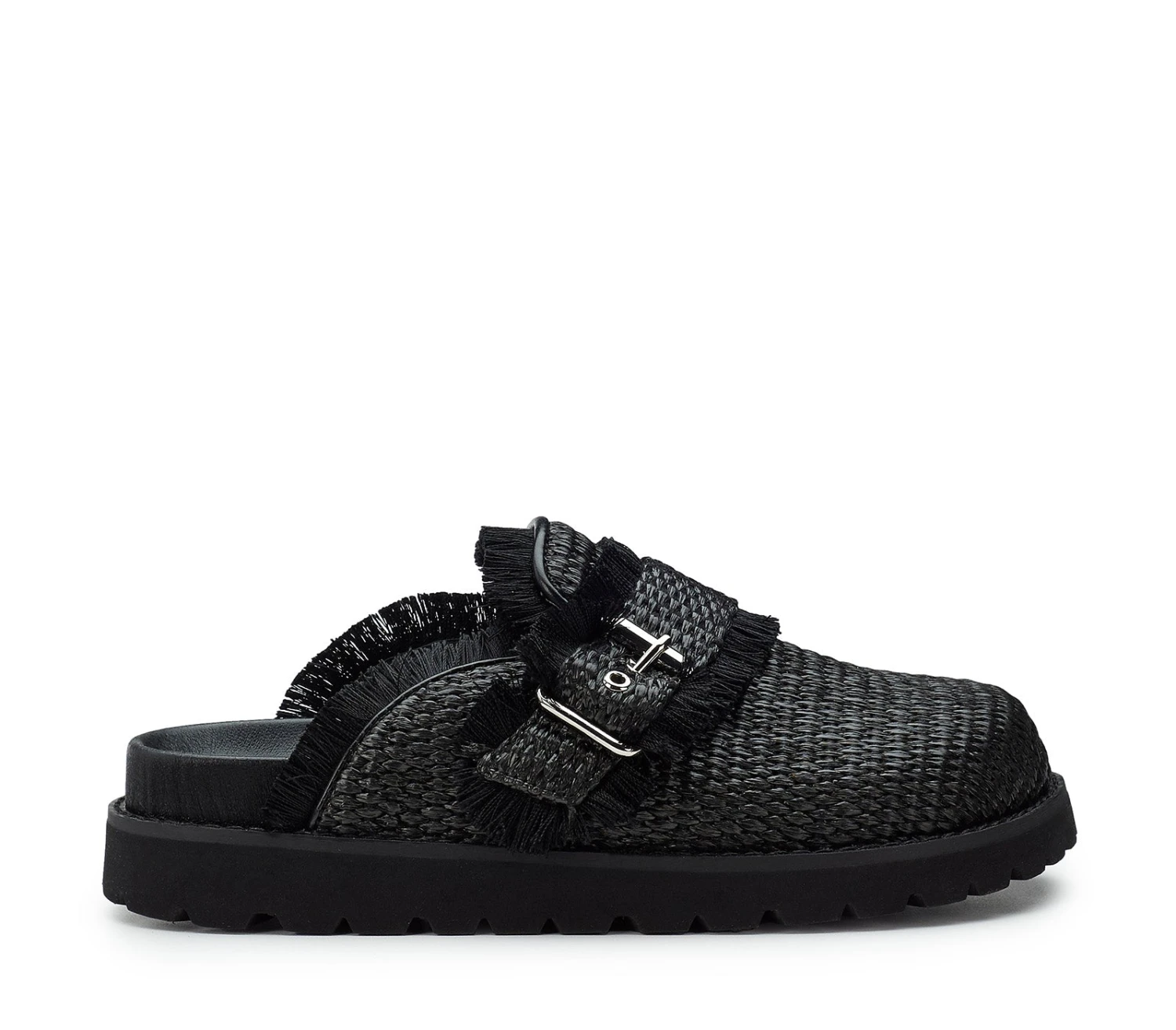Puntate su Cult per delle scarpe di grande effetto come queste sabot: sono caratterizzate da linee pulite, presentano la tomaia in rafia con bordi sfrangiati total black e sono rifinite con fibbie metalliche. Promettono massima comodità da mattina a sera grazie al footbed rivestito in pelle con suola platform e al design basso.