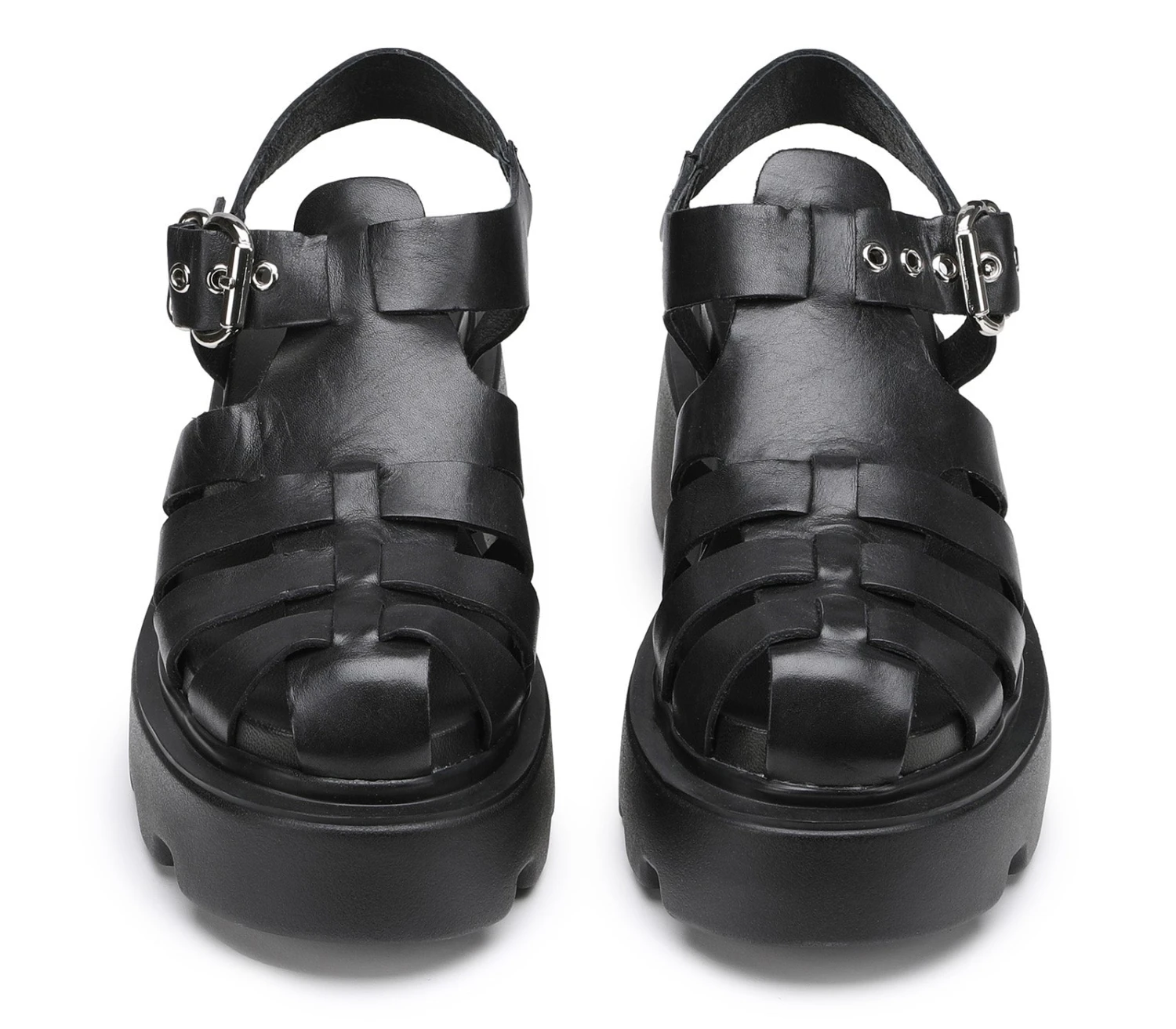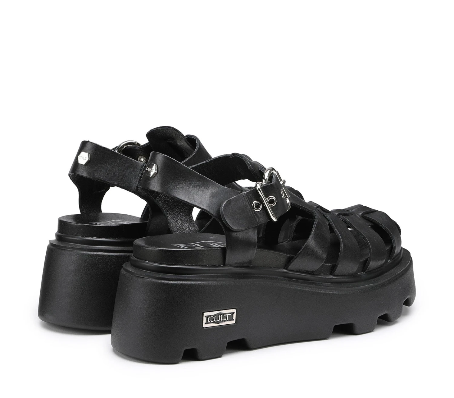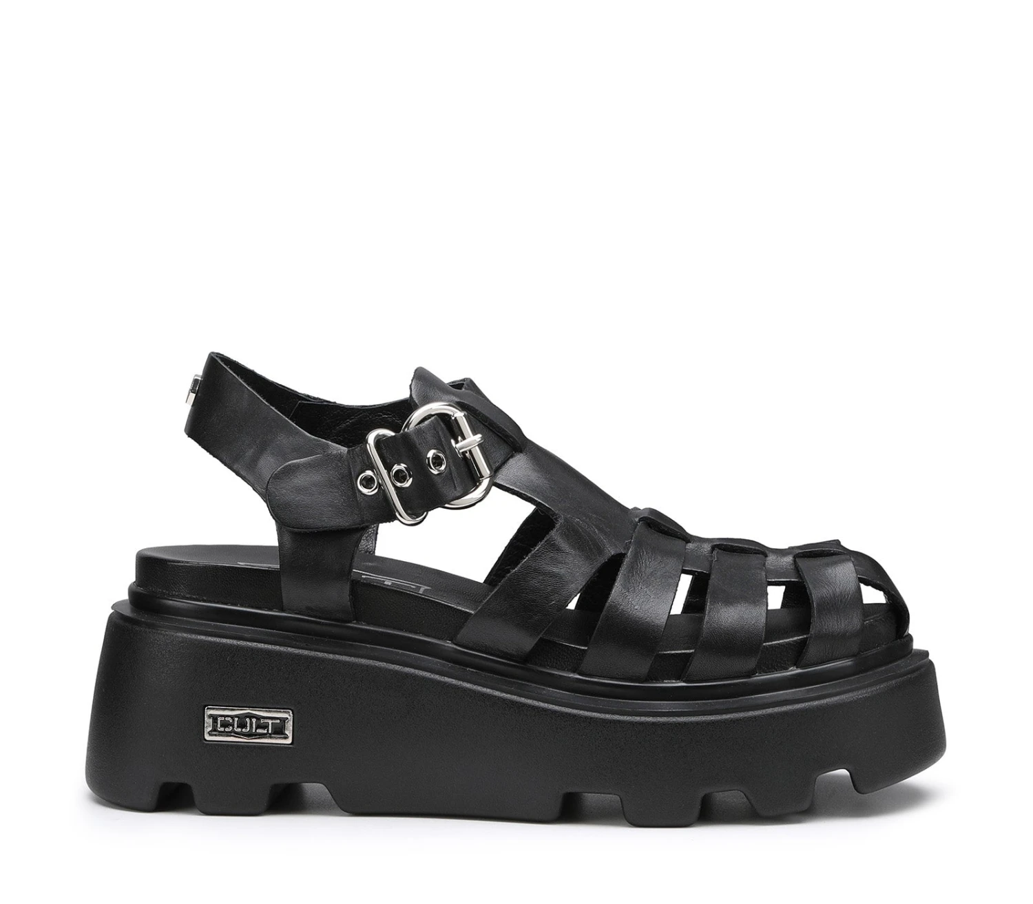 Catturate gli sguardi che contano con questi sandali di Cult. Realizzati in pelle nera con una classica tomaia a gabbia e cinturino alla caviglia, svettano su maxi suole platform e presentano l’inconfondibile targhetta metallica con il logo del brand sulla parte esterna della suola.