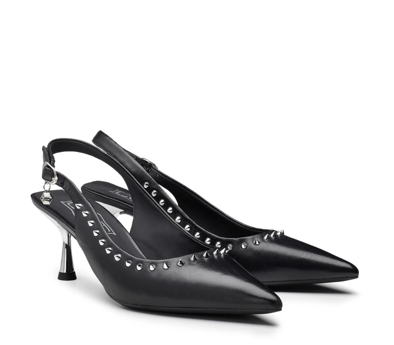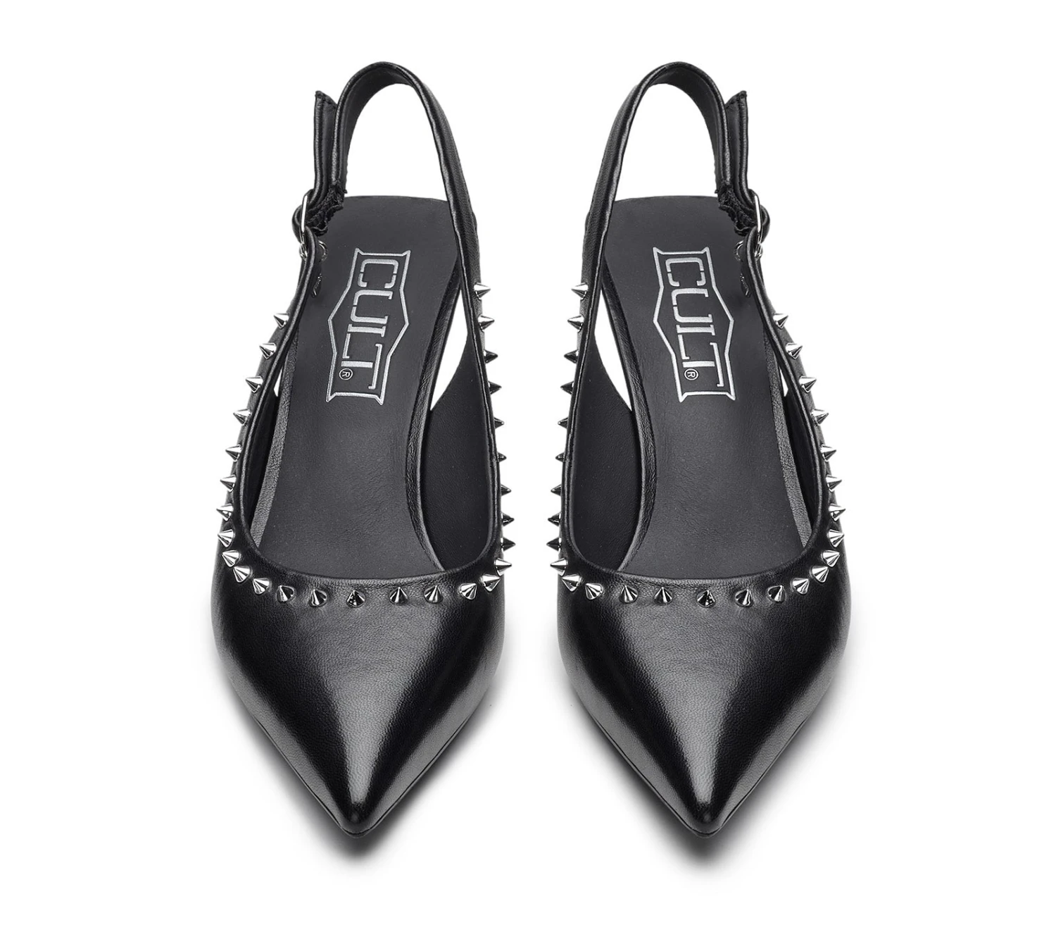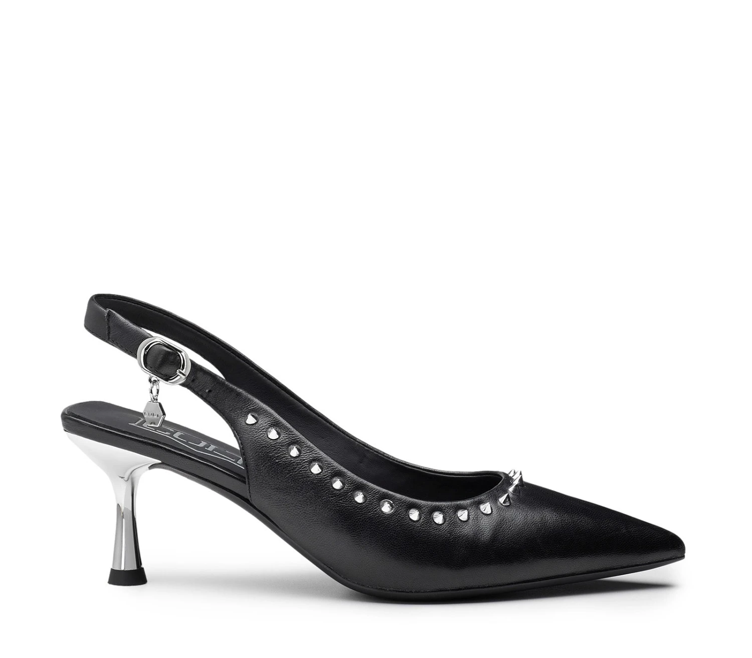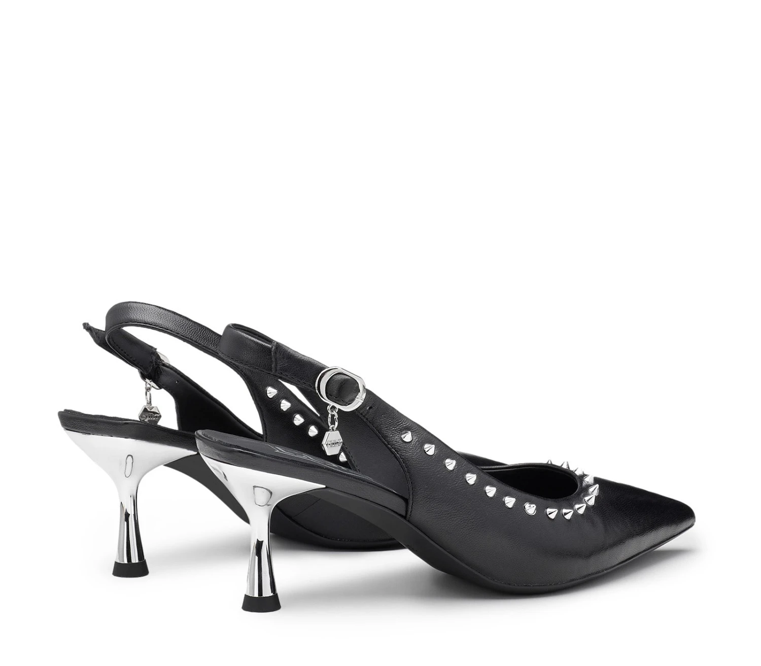 Cult debutta nel mondo dei tacchi con queste pumps slingback Infinitamente eleganti e audaci. Queste pumps sono l’aggiunta perfetta per i vostri look da sera, realizzate in pelle nera con linea affusolata, decorate con una linea di borchie metalliche e poggiano su un tacco specchiato da 40mm.