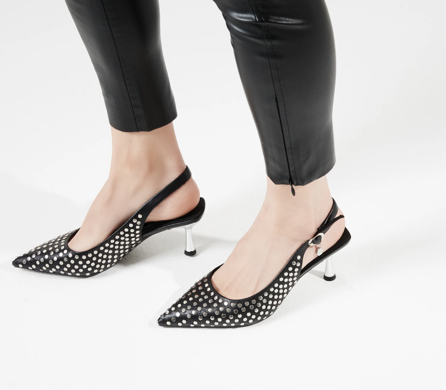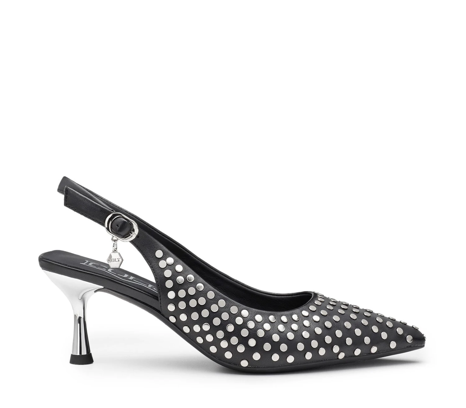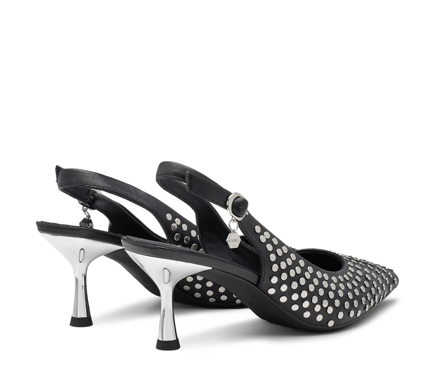 Cult debutta nel mondo dei tacchi con queste pumps slingback Infinitamente eleganti e audaci. Queste pumps sono l’aggiunta perfetta per i vostri look da sera, realizzate in pelle nera con linea affusolata, decorate da borchie metalliche e poggiano su un tacco specchiato da 40mm.