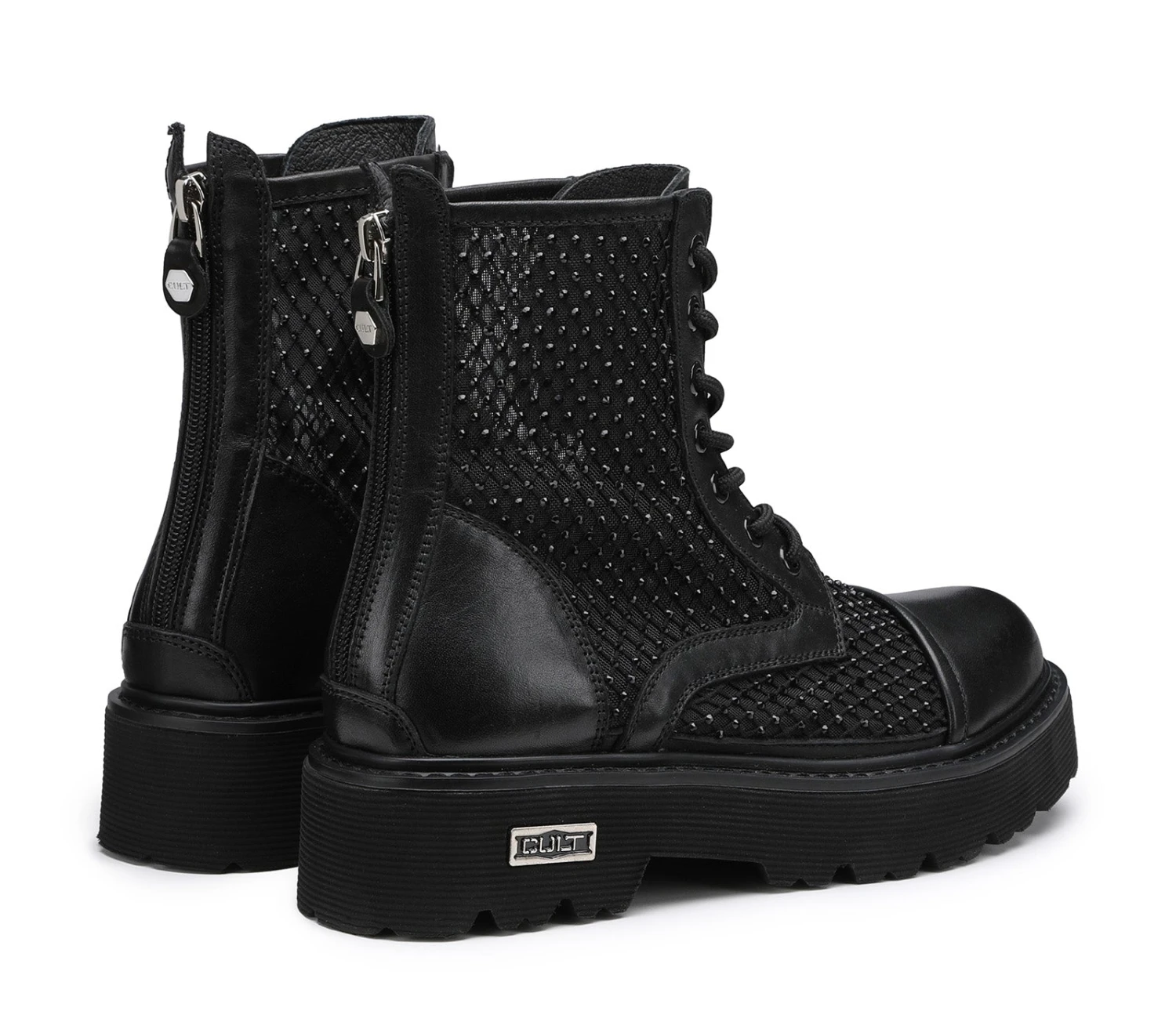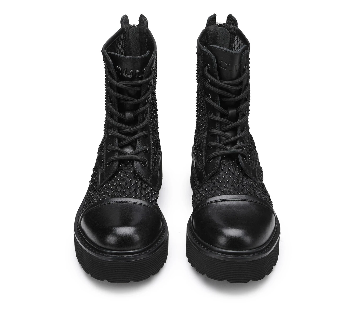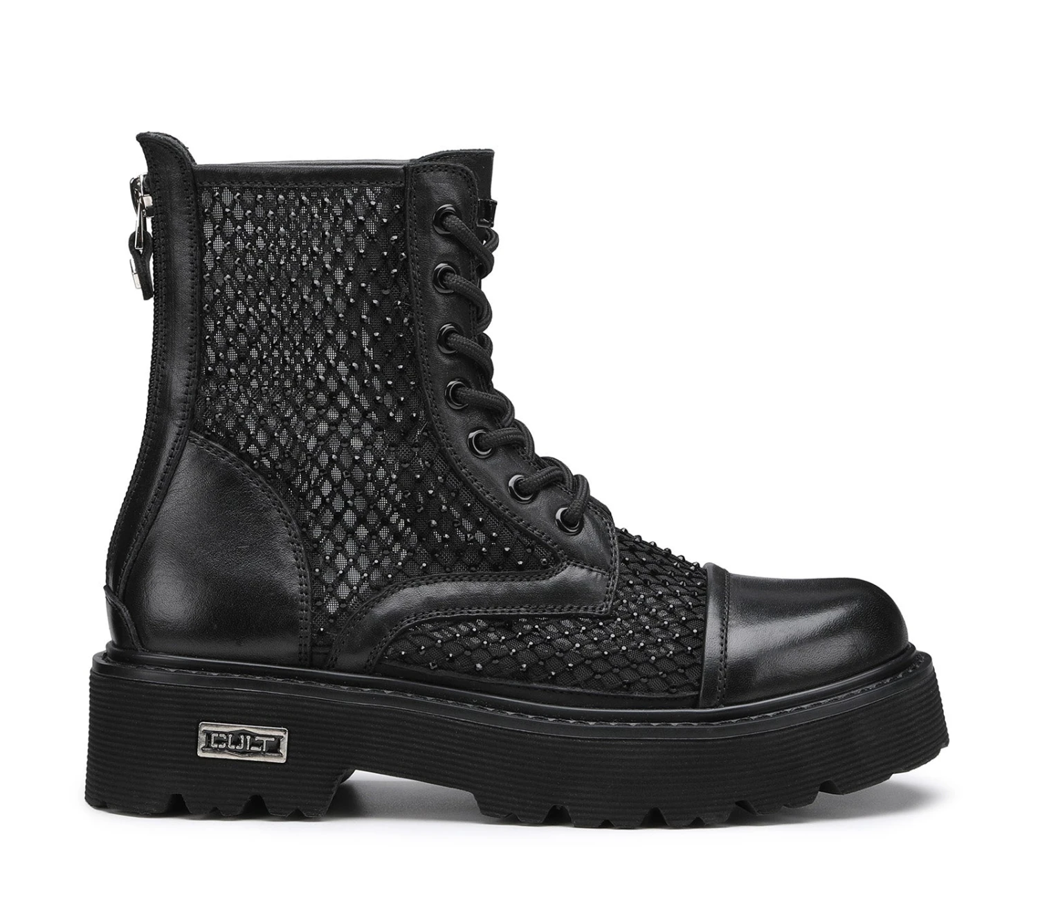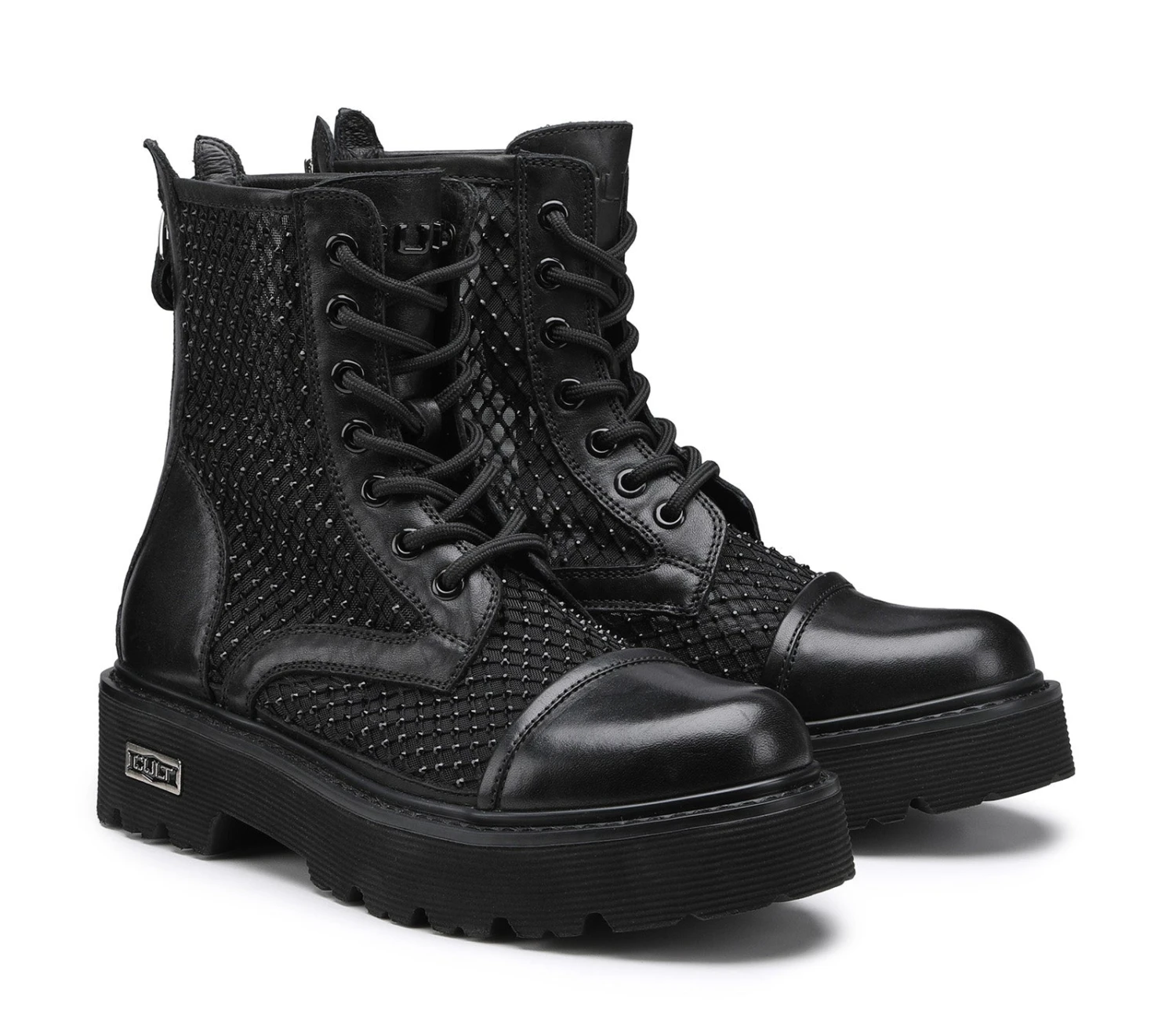 Originali ma dalla fortissima anima rock questi anfibi in pelle nera firmati Cult per questa primavera estate. La rete strass del gambale sfoderato li rende una scarpa gioiello adatta anche alle grandi occasioni, conferendo un tocco di originalità ai vostri outfit. Chiusura tramite stringhe e zip posteriore, altezza suola 5cm