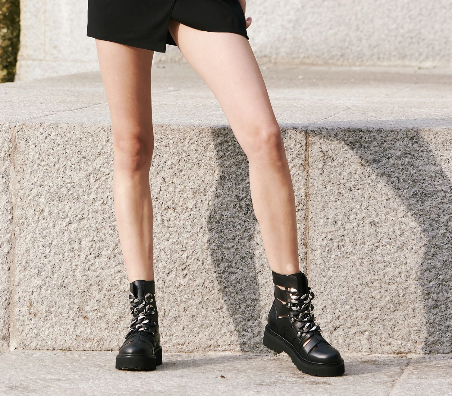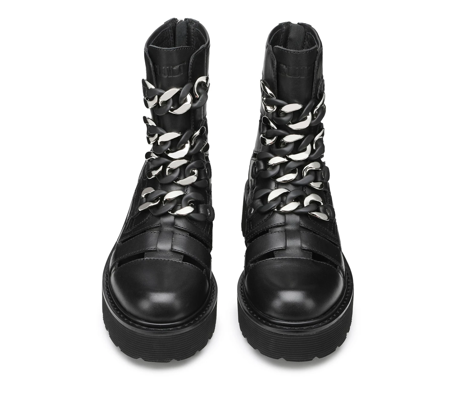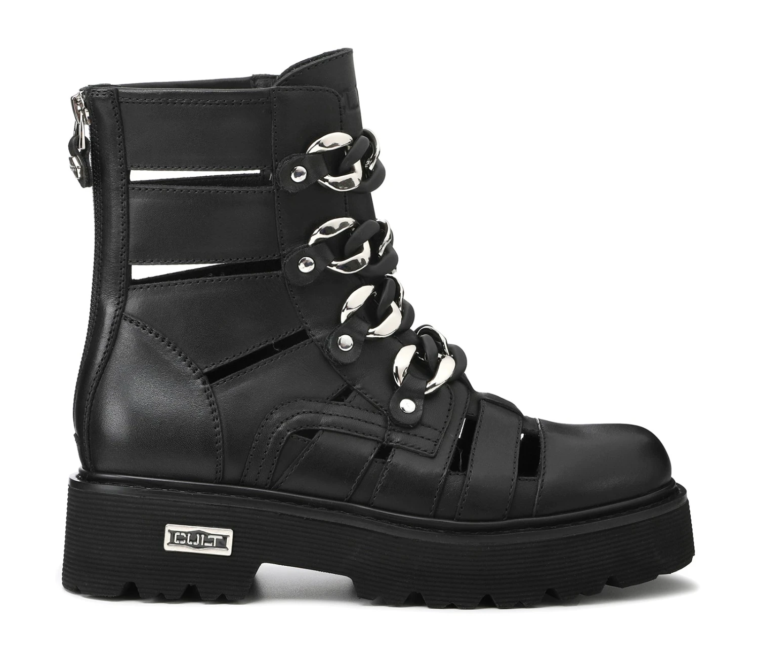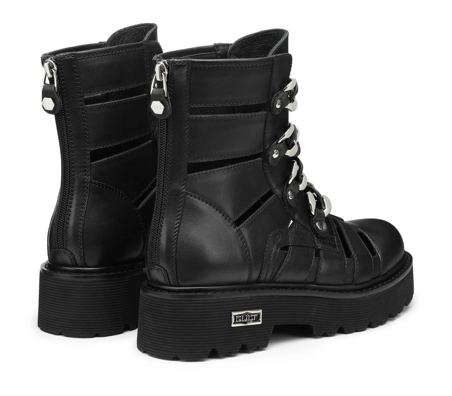Rock e combattivi questi anfibi cut out della famiglia Slash firmati Cult realizzati in pelle nera. Suola importante, chiusura tramite zip posteriore, presentano maxi catene nella parte frontale per un effetto ancora più femminile e grintoso. Altezza suola 5cm