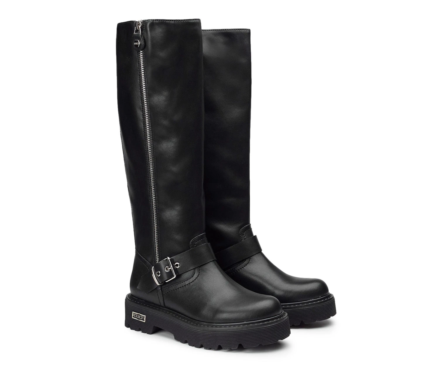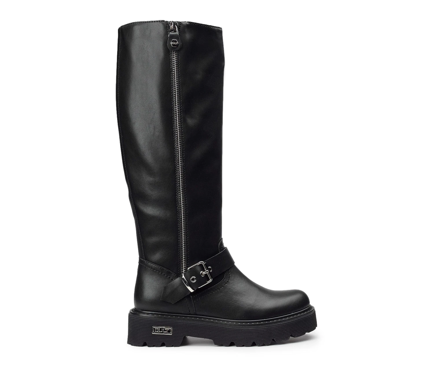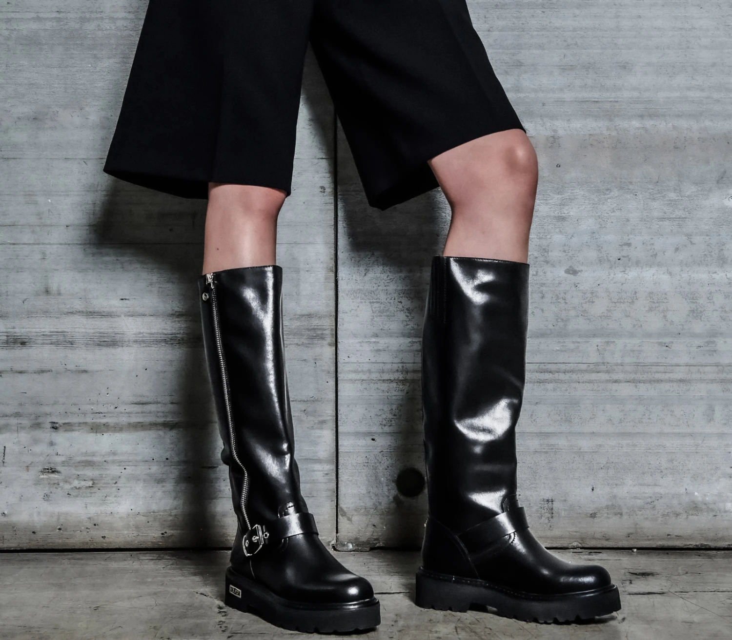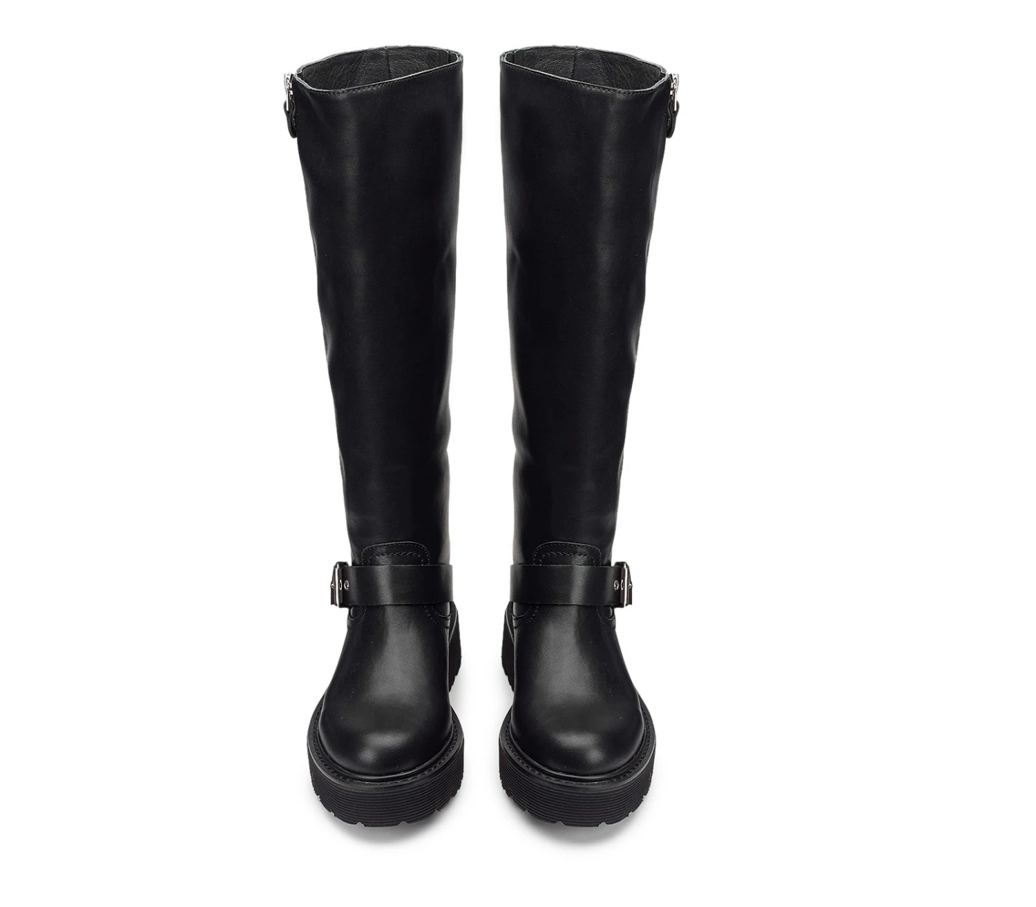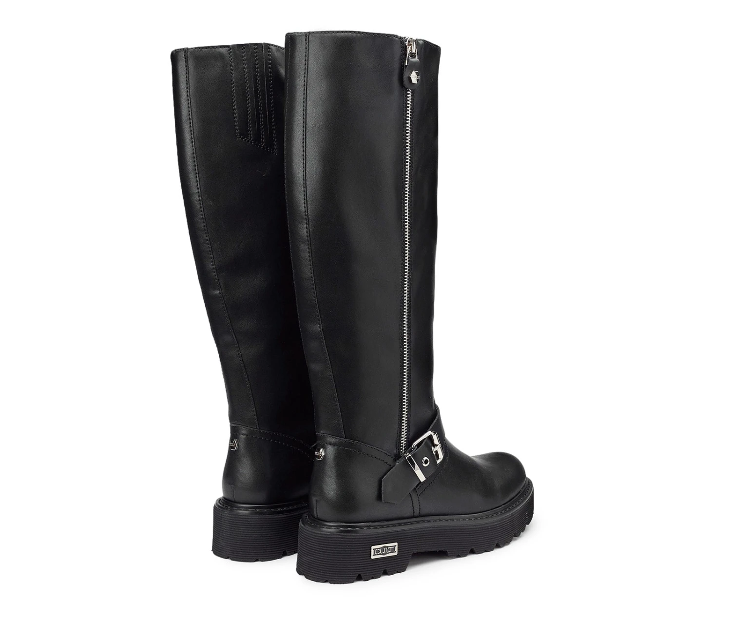 Rinnova il tuo guardaroba con gli stivali biker in pelle liscia nera firmati Cult. Un modello versatile e di carattere a punta tonda classico, con spessa fibbia in metallo color argento, una zip decorativa nella parte esterna del gambale e robusta suola in gomma impreziosita dall’iconica targhetta logata per un’aderenza ottimale. Un’infusione di glamour per i tuoi look di tutti i giorni.