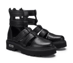 Comodi ma senza rinunciare all’anima rock gli anfibi stringati firmati da Cult per questo inverno. Un modello intramontabile di stivaletti in vitello spazzolato nero con inserti color oro, occhielli in metallo, targhetta con logo sulla suola di gomma e linguetta posteriore. Da indossare con jeans, pantaloni o gonne corte
