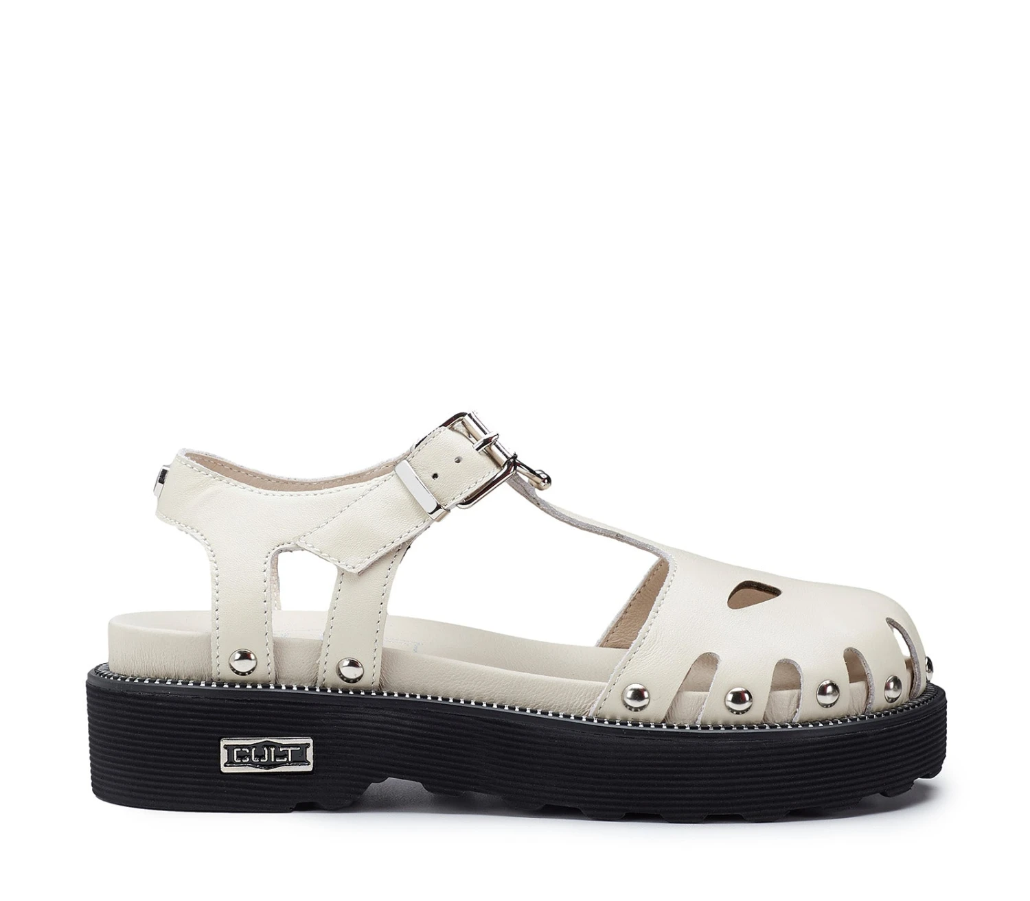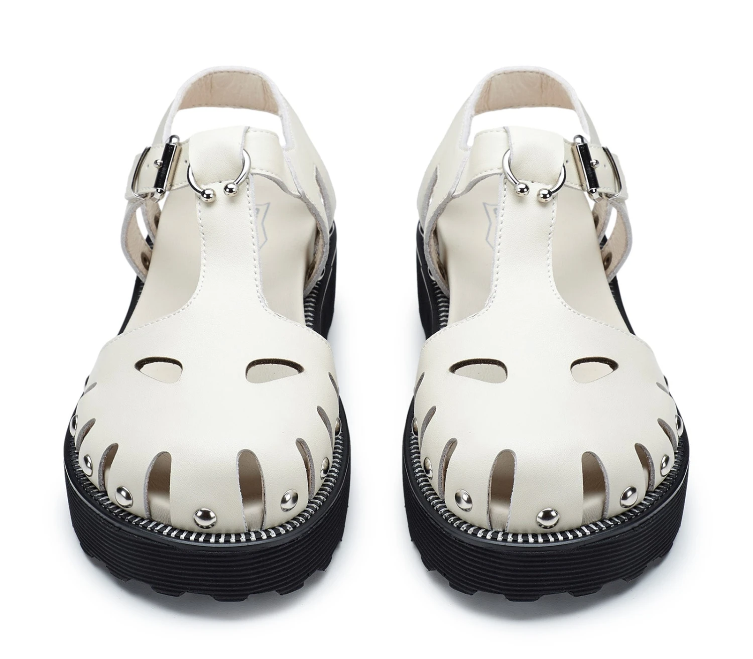 Sabot Mary Jane realizzati in pelle off white con iconico guardolo zip e targhetta metallica con il logo del brand. Tra le caratteristiche principali, una chiusura con fibbia e originali dettagli cut-out.